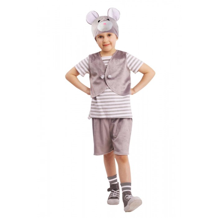 Костюм Мышонок Масик детский – простой, но очень милый карнавальный образ для костюмированных праздников в детском саду. Универсальный размер рассчитан на мальчиков и девочек от 4 до 6 лет. Комплект состоит из серой жилетки, шорт и шапки-маски.