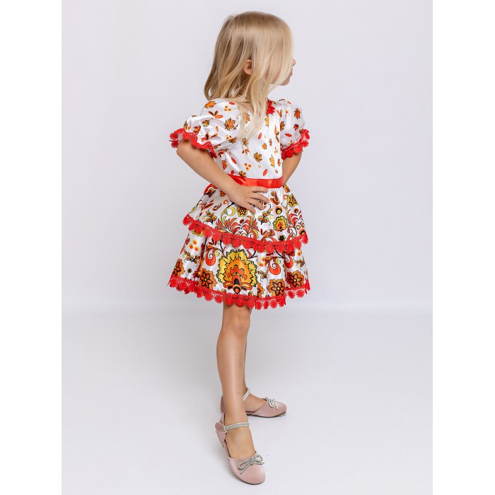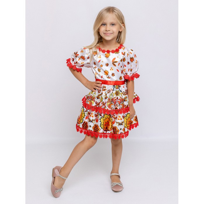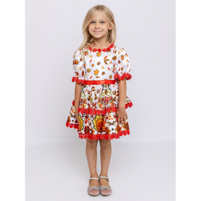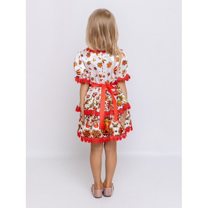 Карнавальный костюм Осень Золотая для девочки 4-6 лет. В комплекте платье с национальными узорами. Платье с короткими рукавами украшено русским народным рисунком. Детский карнавальный костюм из коллекции Времена года на роль Осени подойдет для праздников в детском саду.