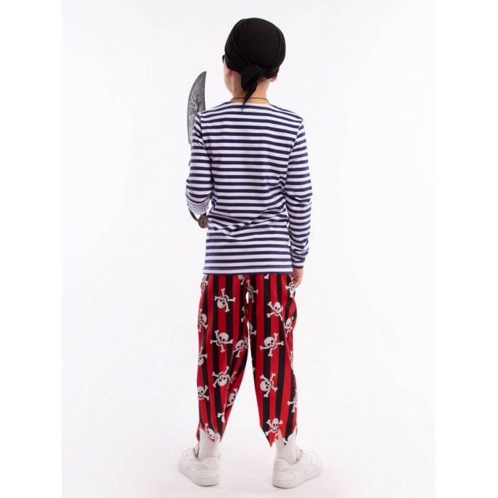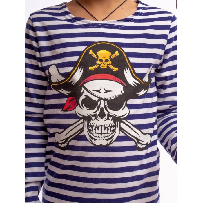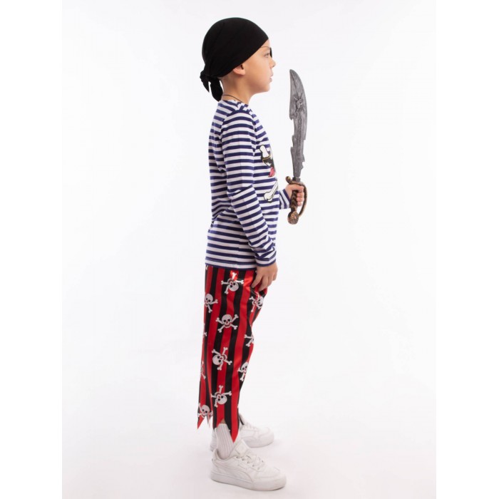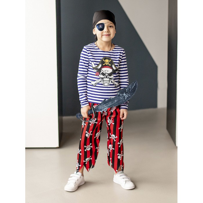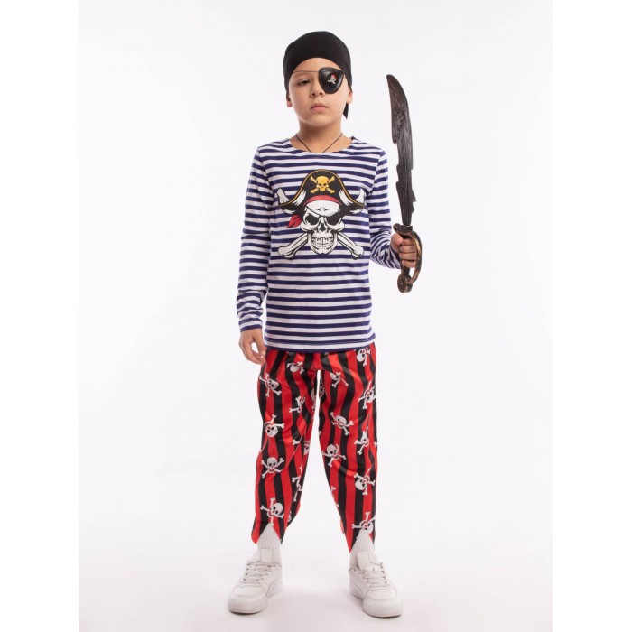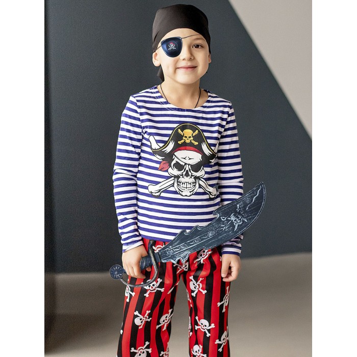 Карнавальный костюм Пирата Джейка для мальчика 3-10 лет. В комплекте тельняшка, брюки, бандана, повязка на глаз, сабля. Тельняшка с длинным рукавом и печатью в виде пиратского черепа на груди. Брюки с рваным низом и принтом.