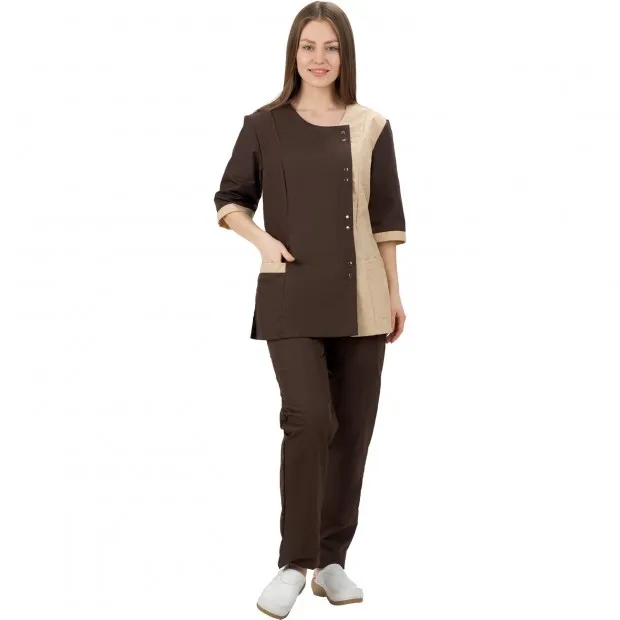 Костюм женский "Злата" состоит из куртки и брюк. Куртка прямого силуэта с ассиметричной застёжкой на кнопки. Рукав длиной ¾, срезы карманов и рукавов отделаны полоской из контрастной ткани. Брюки прямые, по линии талии стянуты эластичной лентой. Костюм предназначен для защиты от общепроизводственных загрязнений.