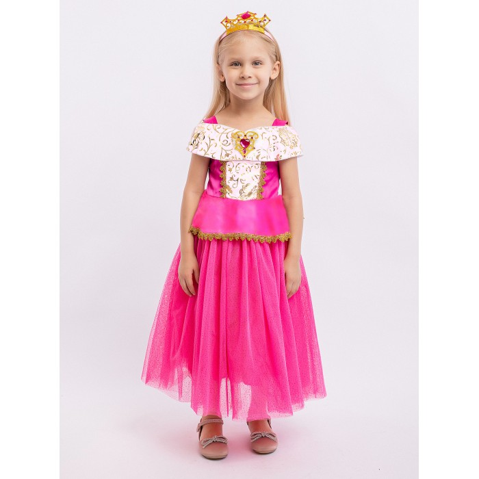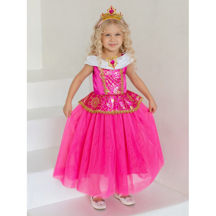 Карнавальный костюм для девочки 5-10 лет Принцесса Сабрина. Розовое пышное платье на бретелях с открытыми плечами. Утяжка по спинке. Ободок с золотой короной. На груди нашивка в виде сердца с блестящим камнем. Юбка пышная многослойная длинная.