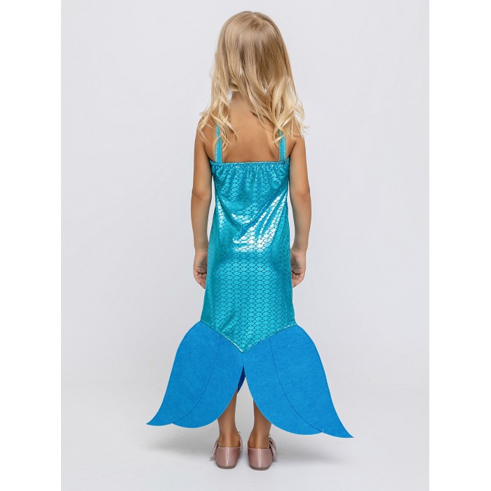 Карнавальный костюм для девочки Русалочка представляет собой нарядное голубое платье на лямках. Платье выполнено из блестящей ткани с рисунком чешуи и заканчивается хвостом из фетра. Яркий сценический образ, в котором любая девочка будет звездой праздника.