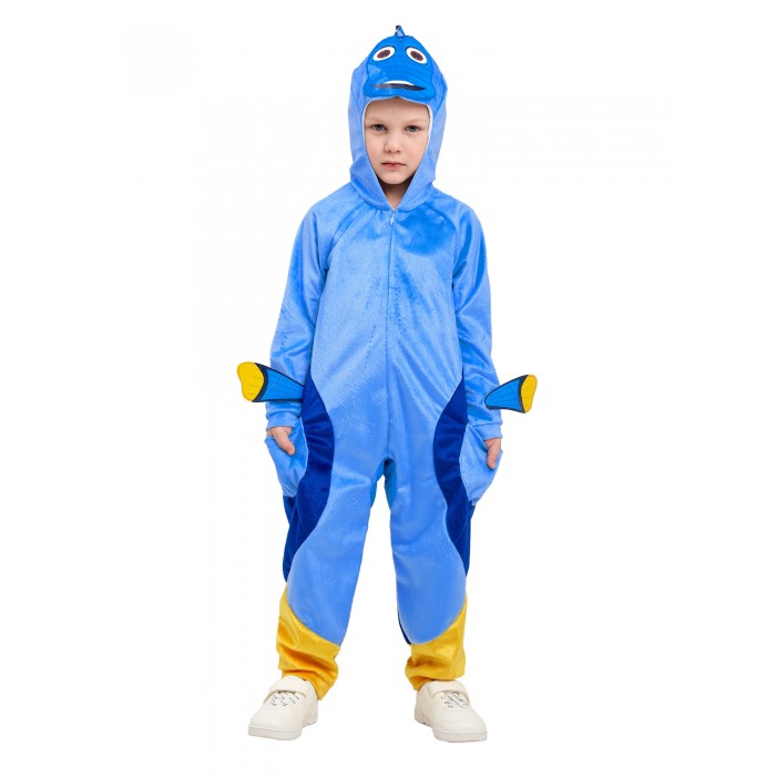 Костюм Рыбка Дори детский синий представлен в виде плюшевого комбинезона-кигуруми. Смешная героиня мультика "В поисках Немо" Дори постоянно все забывает, но тем не менее во всем помогает главному герою.