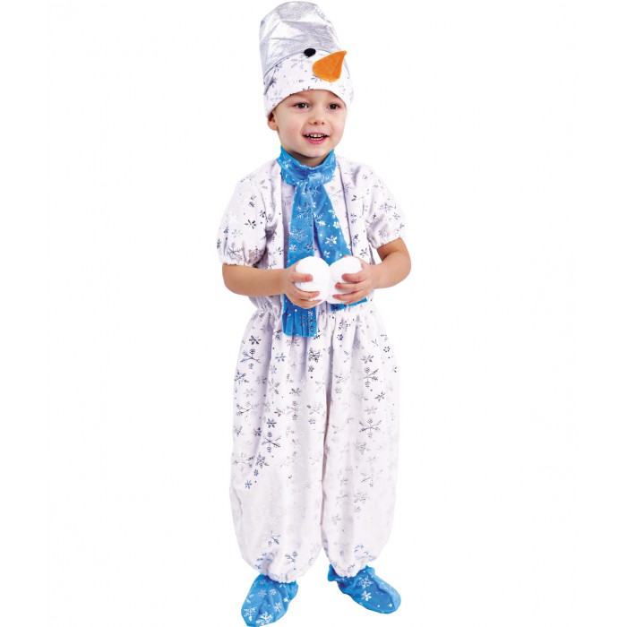 Мальчик, который придет на праздник в костюме Снеговика, непременно будет в центре всеобщего внимания. Отличный выбор для ребенка 3-5 лет, который отправляется на праздничный утренник или новогоднюю елку. Костюм белого цвета имеет удобный крой, не стесняющий движений. В образе очень красиво расставлены цветовые акценты, так, например, цвет шарфика перекликается с цветом башмачков. А главной изюминкой образа стало блестящее ведерко.