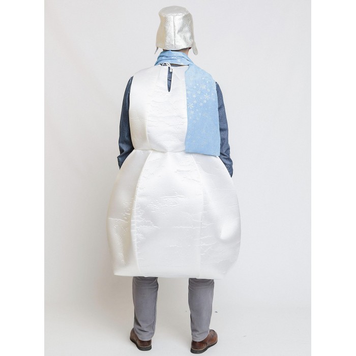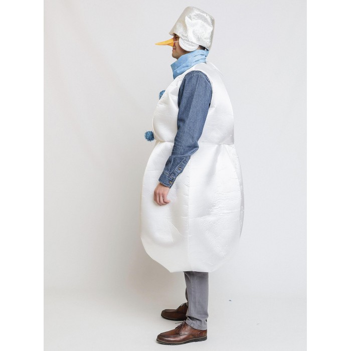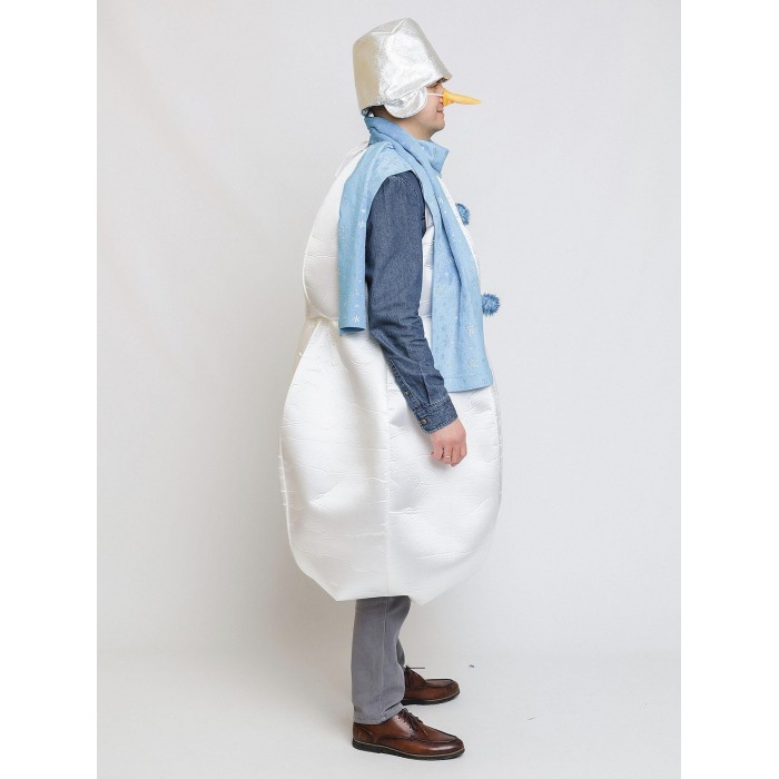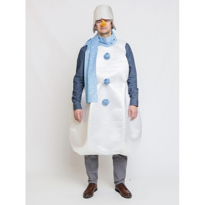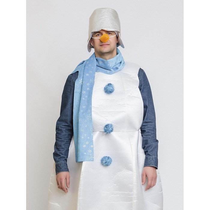 Карнавальный костюм на Новый год для взрослых Снеговик Морковкин. В комплект входит белый костюм без рукавов, голубой шарф, шапка "Ведро", нос-морковка на резинке. Костюм Снеговика отлично подойдет для новогодних праздников, карнавалов, а также детских елок и спектаклей.