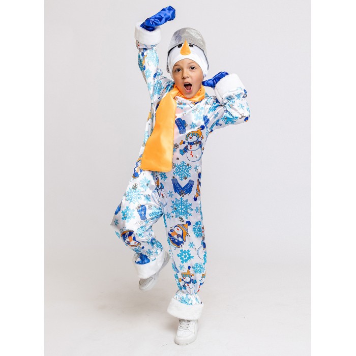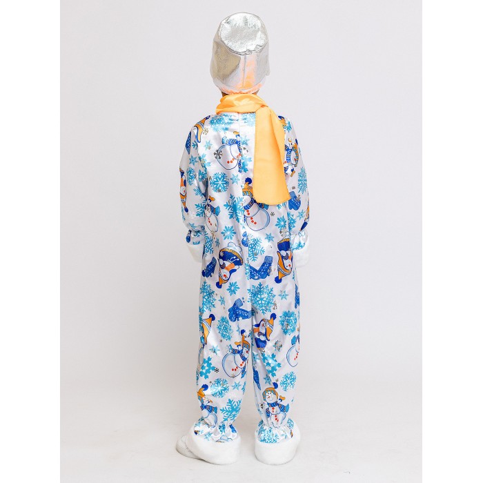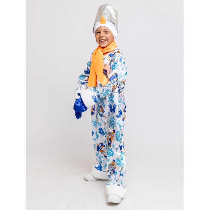 Благодаря свободному крою ребенок в костюме будет чувствовать себя максимально удобно, а еще он точно будет отличаться от остальных. Яркий карнавальный наряд, состоящий из принтованного комбинезона, шапки, варежек и шарфа, сделает мальчика звездой всех новогодних елок. А еще в карнавальном костюме Снеговика можно играть в спектакле или поставить творческий номер.