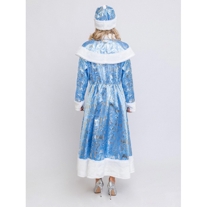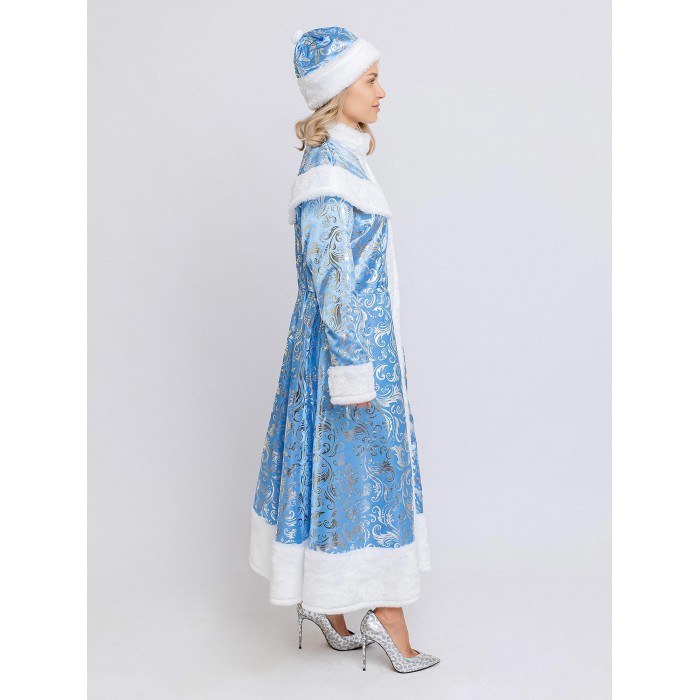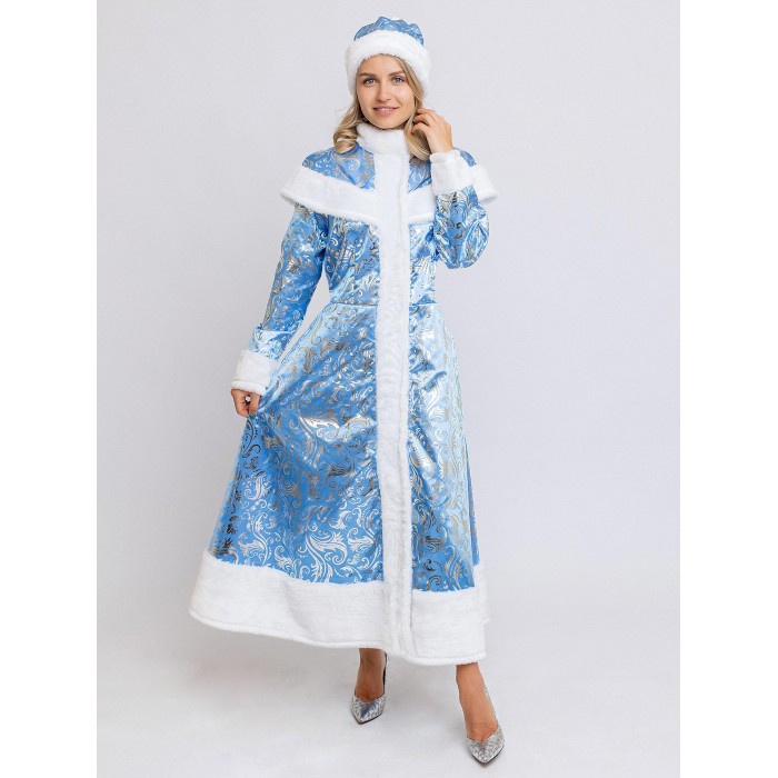 Костюм Снегурочки Арины взрослый на рост 164 (размер 50). В комплекте приталенная шубка и шапка. Шуба голубая длинная с серебристым принтом на сатине, шапка в тон. Отделка из белого искусственного меха.