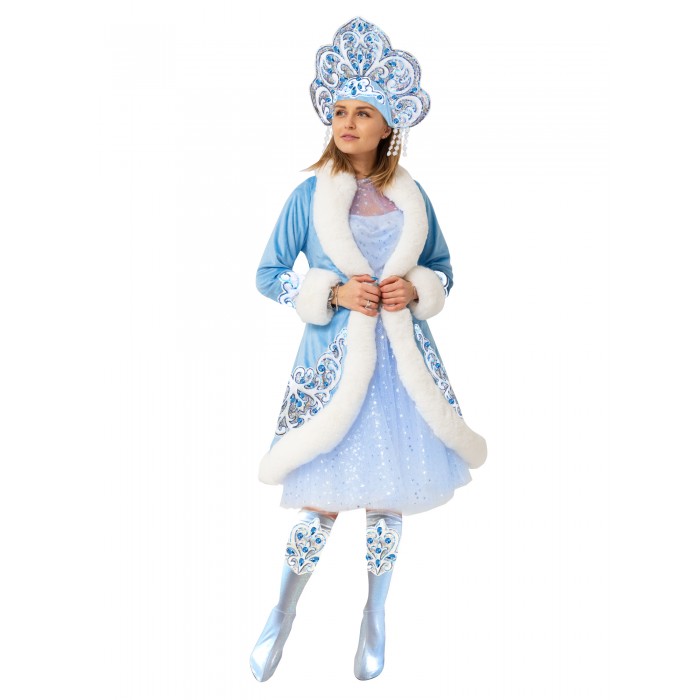 Костюм Снегурочки Боярской для взрослых - эффектный наряд к детским и взрослым новогодним праздникам. Воздушный и невероятно красивый образ внучки Деда Мороза выполнен в голубом цвете. В комплект входит платье, шуба, кокошник, сапожки.