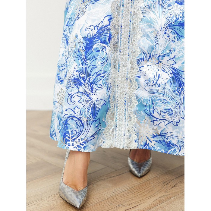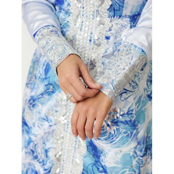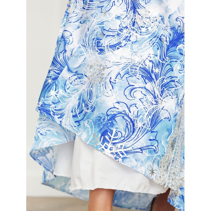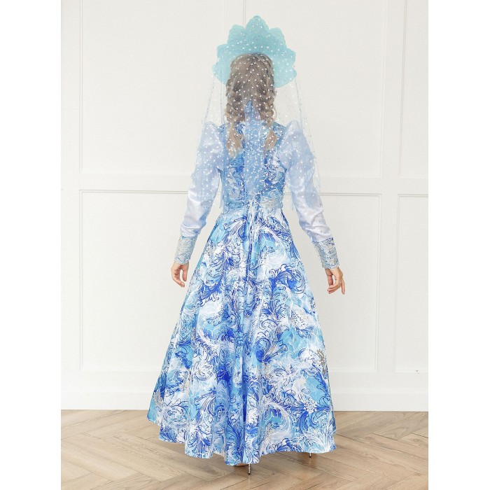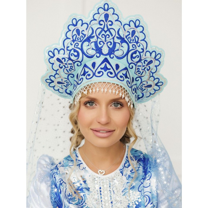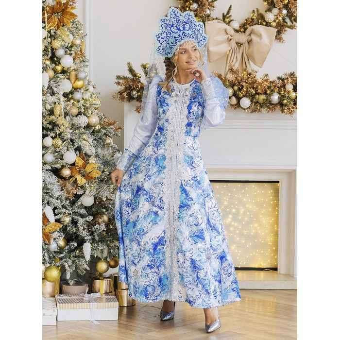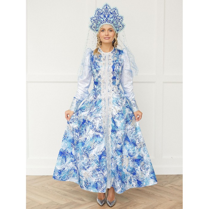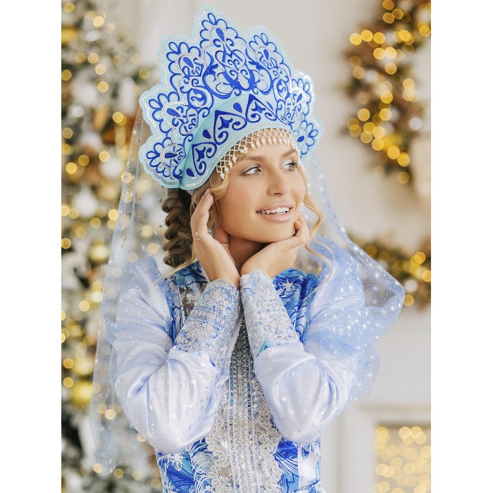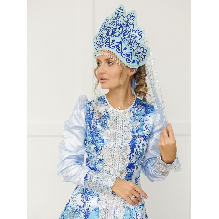 Карнавальный костюм новогодний взрослый Снегурочка Царевна. В комплект наряда входит платье, с узором и кокошник. Платье длинное приталенное украшено узорчатой тесьмой. Кокошник с полупрозрачной блестящей вуалью. Костюм Снегурочки доступен в размерах 44 и 50.