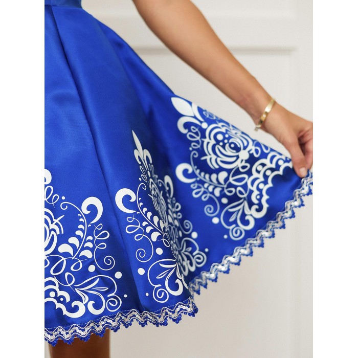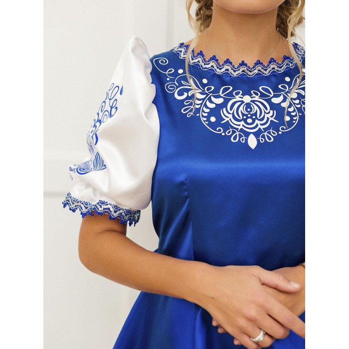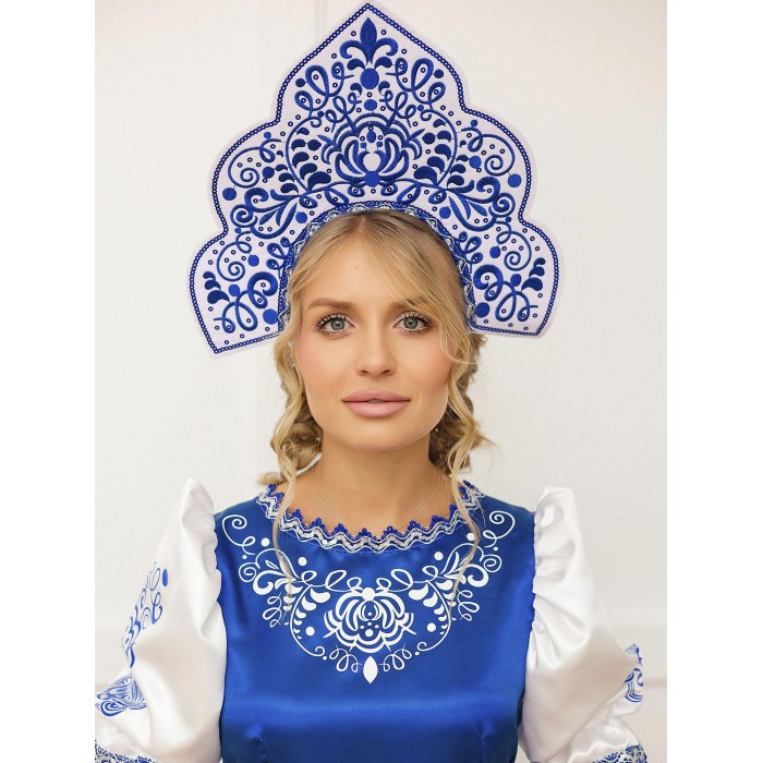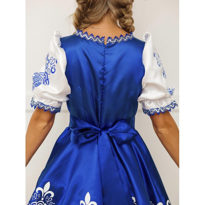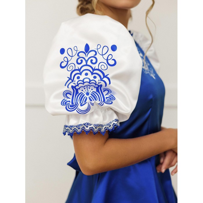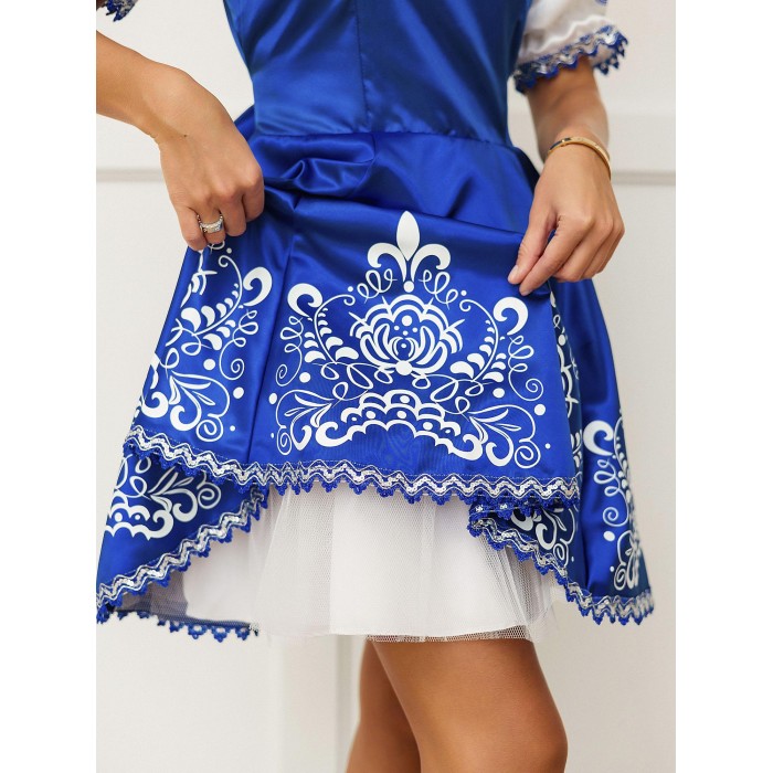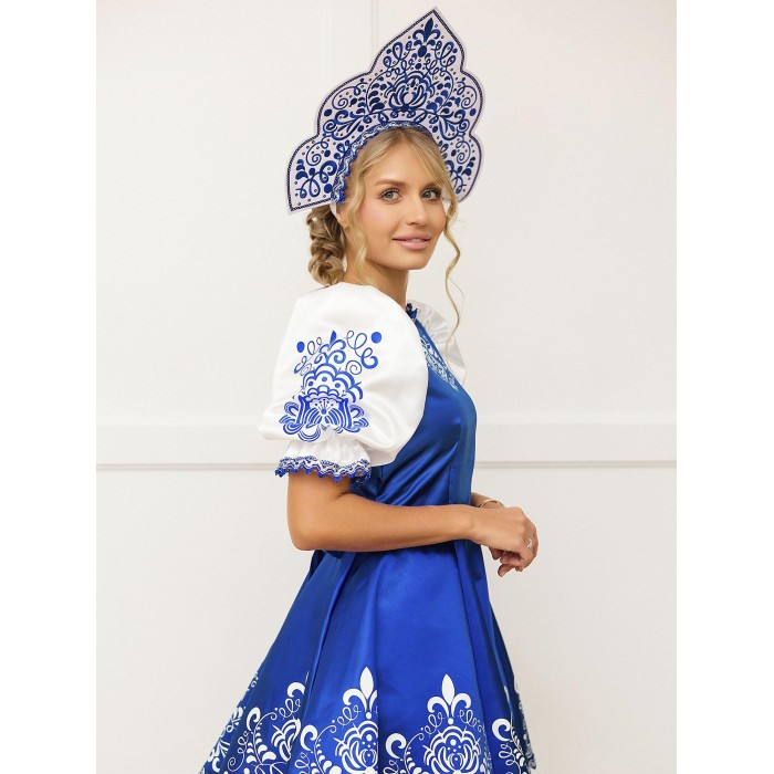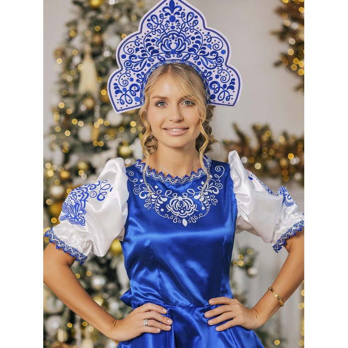 Карнавальный костюм на Новый год Снегурочка Лада для взрослых. В комплект праздничного наряда входит сине-белое платье и кокошник. Платье имеет короткие объемные рукава со сборкой на резинку. Пышный подол украшен белыми узорами. Костюм Снегурочки выполнен из лёгкой атласной ткани, в нём будет комфортно провести долгое время на празднике.