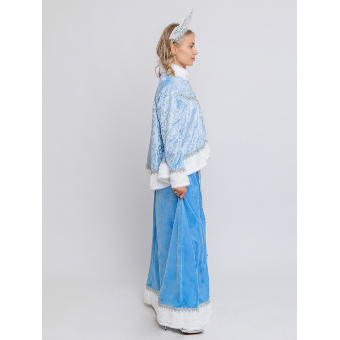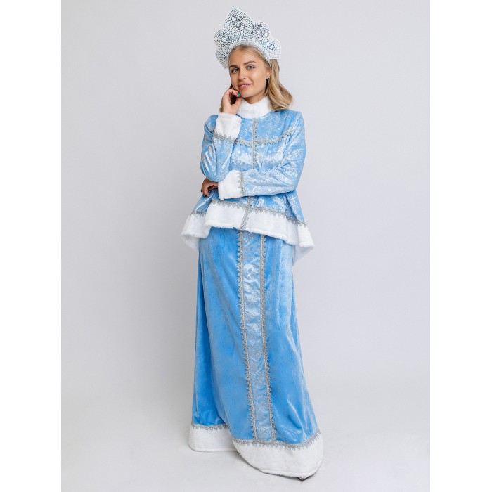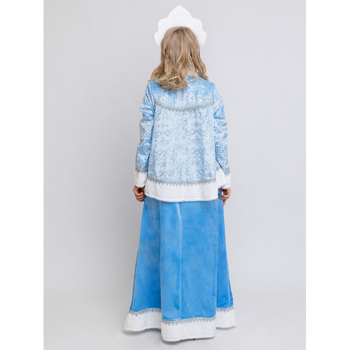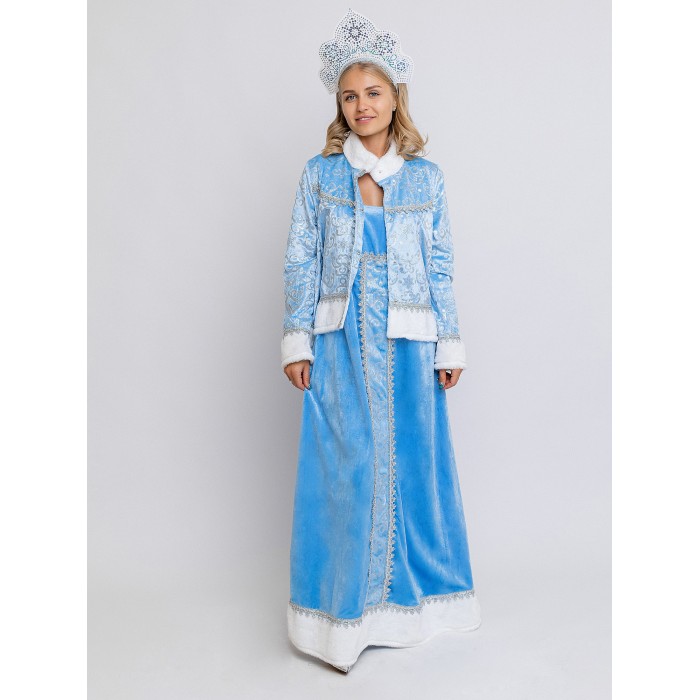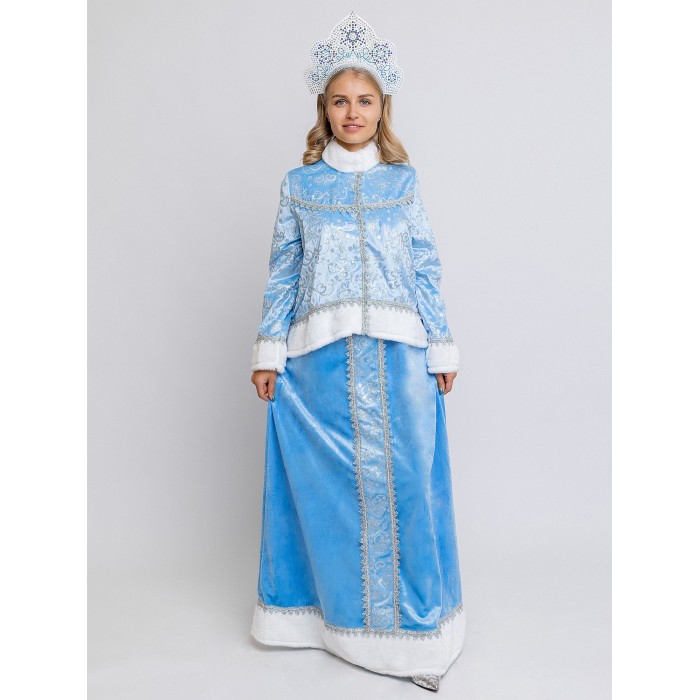 Еще одна вариация образа Снегурочки – карнавальный костюм Снегурочка Настенька. Это теплый и по-настоящему зимний образ порадует всех представительниц прекрасного пола. Наряд отлично подойдет для празднования Нового года в любом формате, будь то детский утренник/спектакль или веселый корпоратив на работе. Также наряд могут приобрести те, кто играет роль Снегурочки профессионально. В комплект образа входит жакет, сарафан и кокошник.