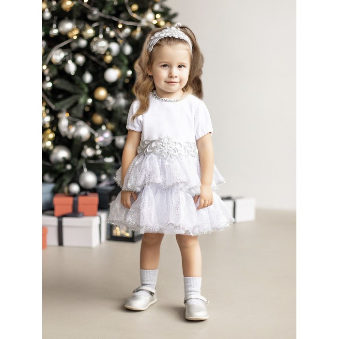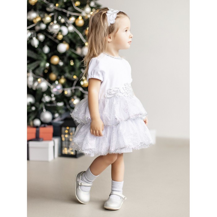 Карнавальный костюм Снежинка для девочки до 1,5 лет. В комплекте платье с подъюбником и повязка на голову. Платье белое украшено тесьмой с блестками и мишурой, а также блестящими нашивками из фетра.