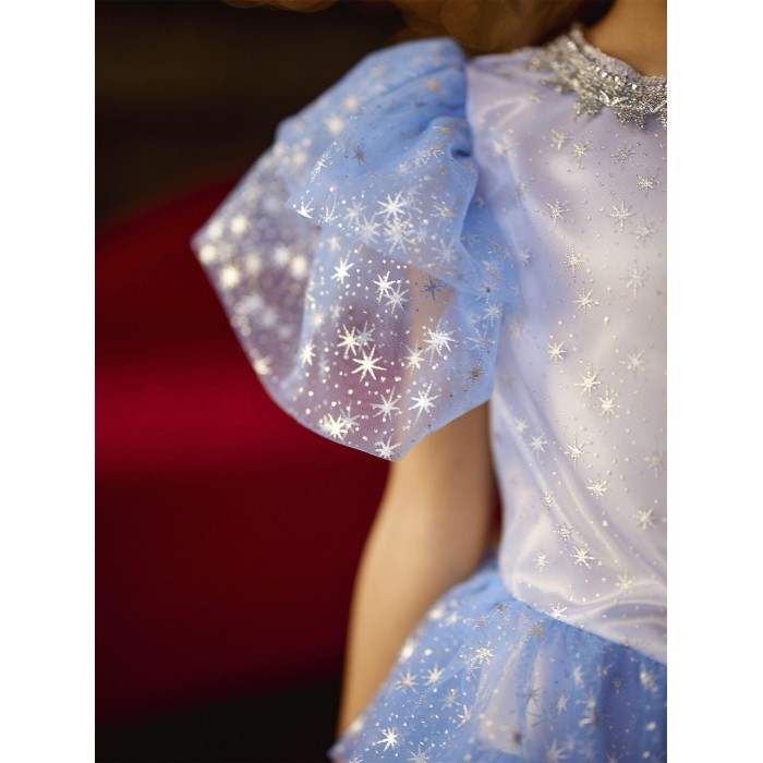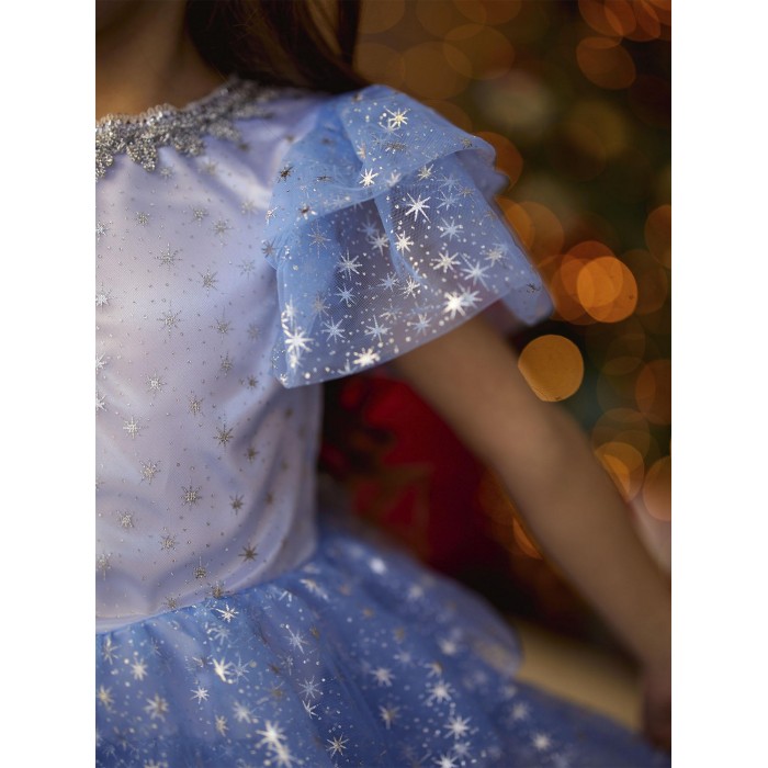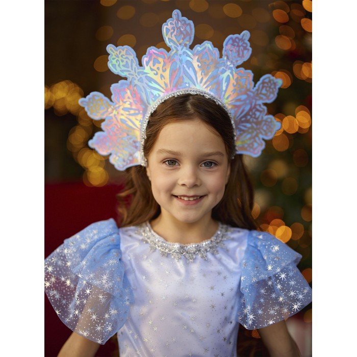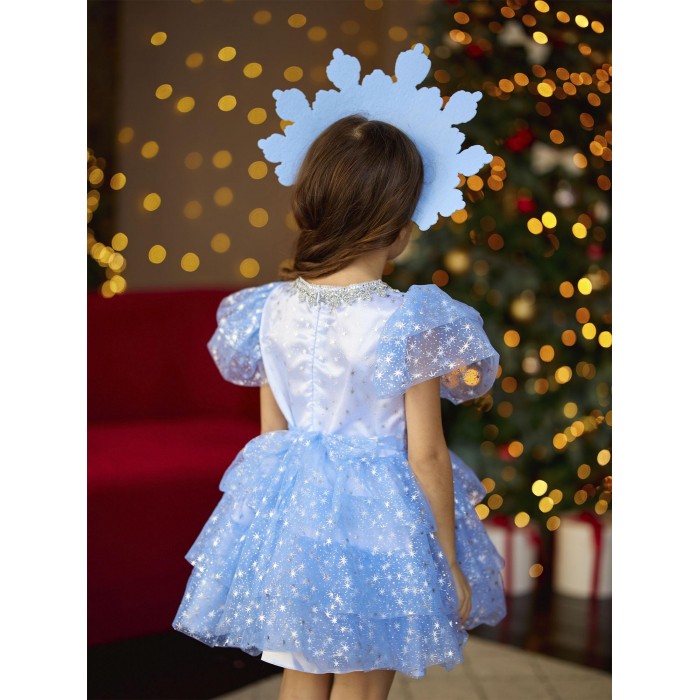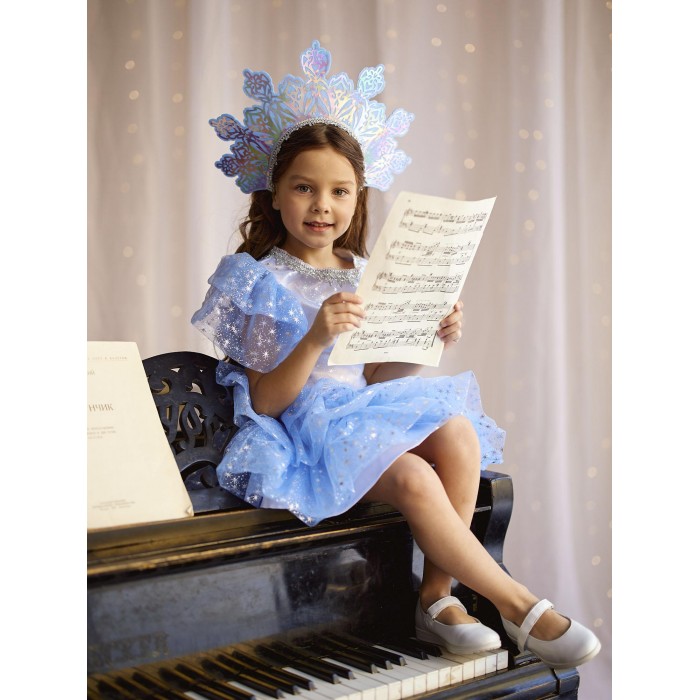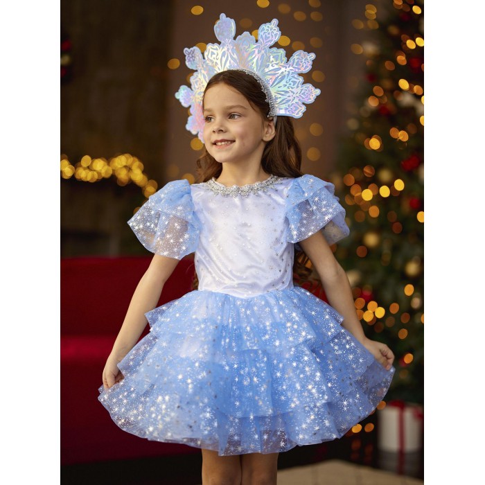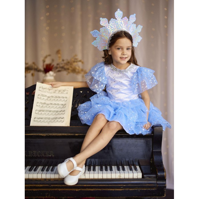 Костюм Снежинка Эмма представляет собой изысканное пышное платье, выполненное с тремя ярусами сборки сетки на юбке, что придает ему волшебный и воздушный вид. Спинка платья оснащена утяжкой, что обеспечивает идеальную посадку и комфорт при носке. Кокошник, который идет в комплекте, надежно фиксируется на голове благодаря резинке, дополняя образ сказочной снежинки. Этот костюм идеально подходит для карнавальных мероприятий, утренников и праздничных выступлений.