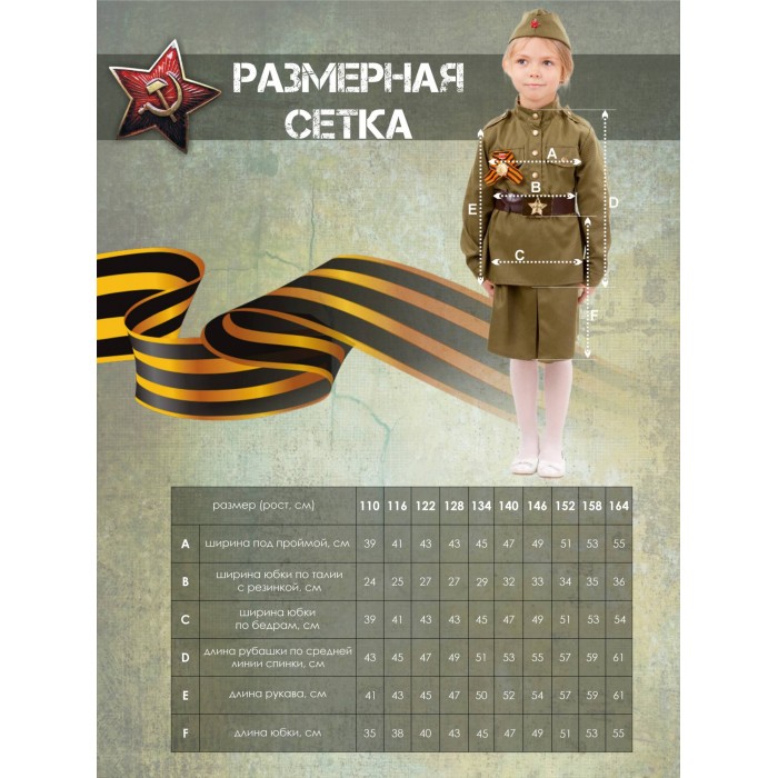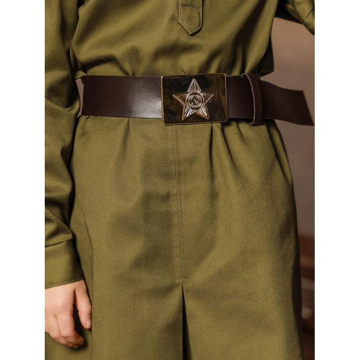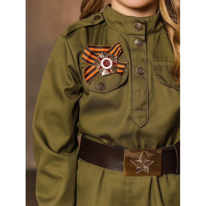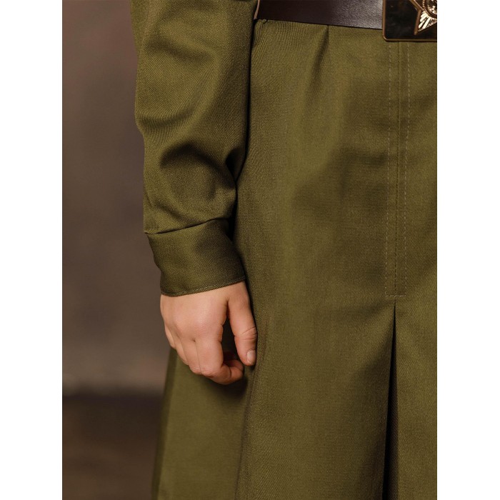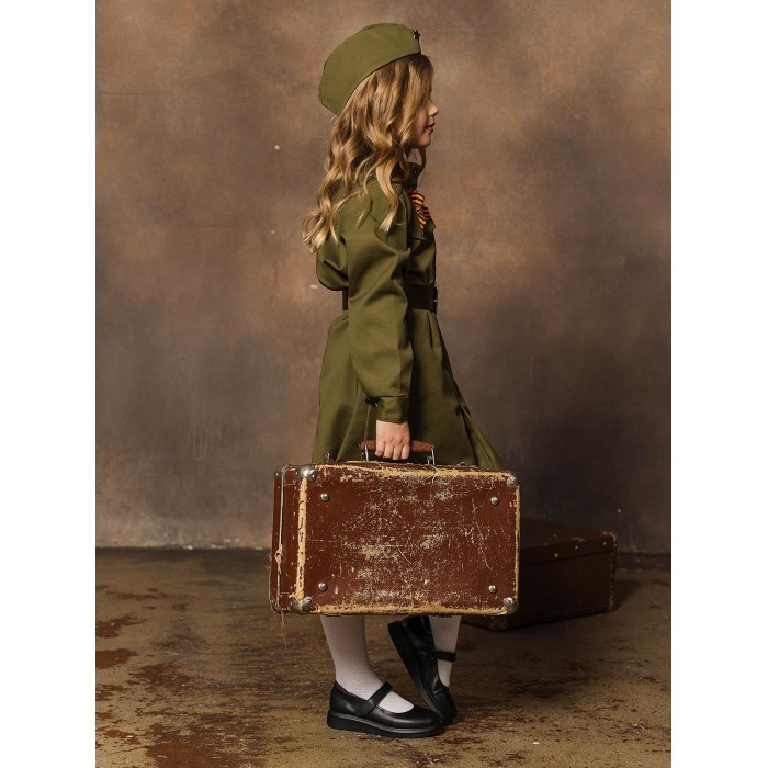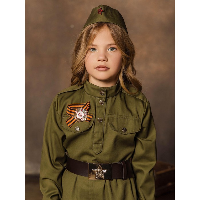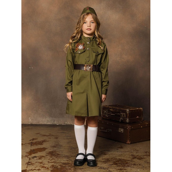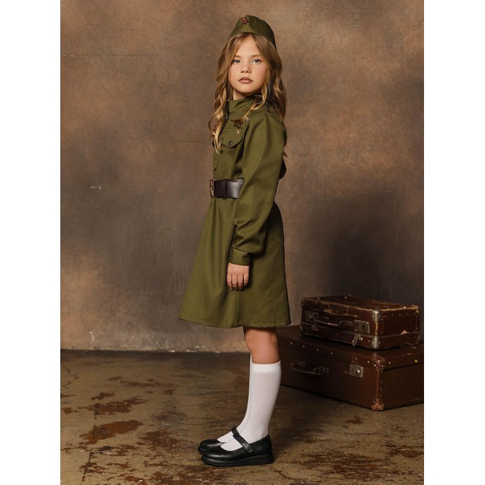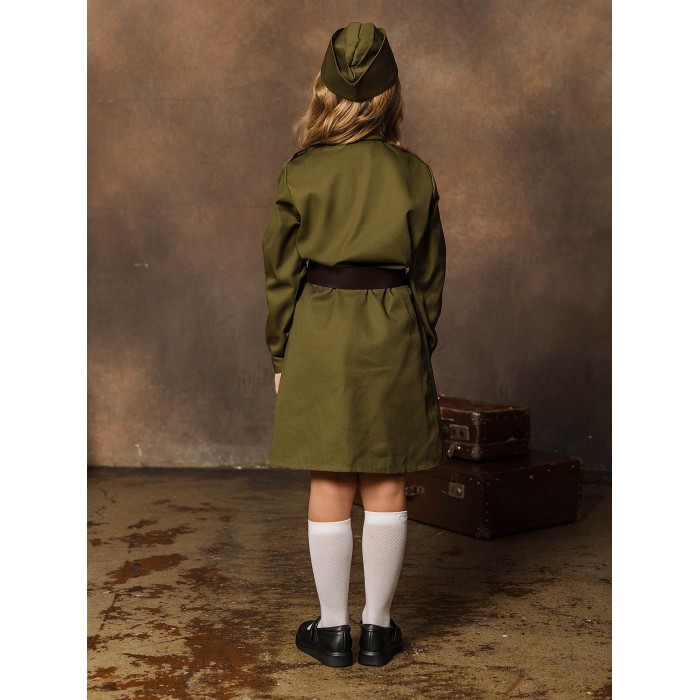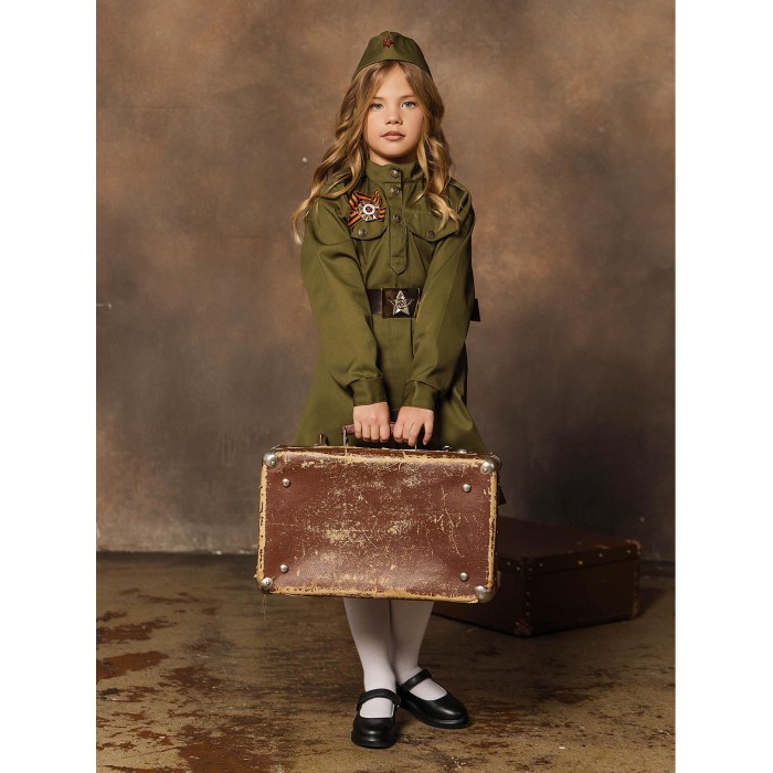 В таком костюме можно отправиться поздравлять ветеранов, участвовать в спектакле или пойти на парад. Костюм Солдатка – вариация костюма солдата, но для девочек. Цвет костюма – защитный зеленый, тип ткани – диагональ. В комплект, помимо гимнастерки, пилотки и ремня, входит юбка.