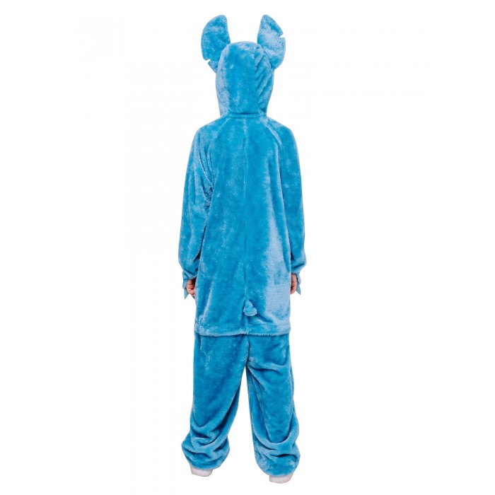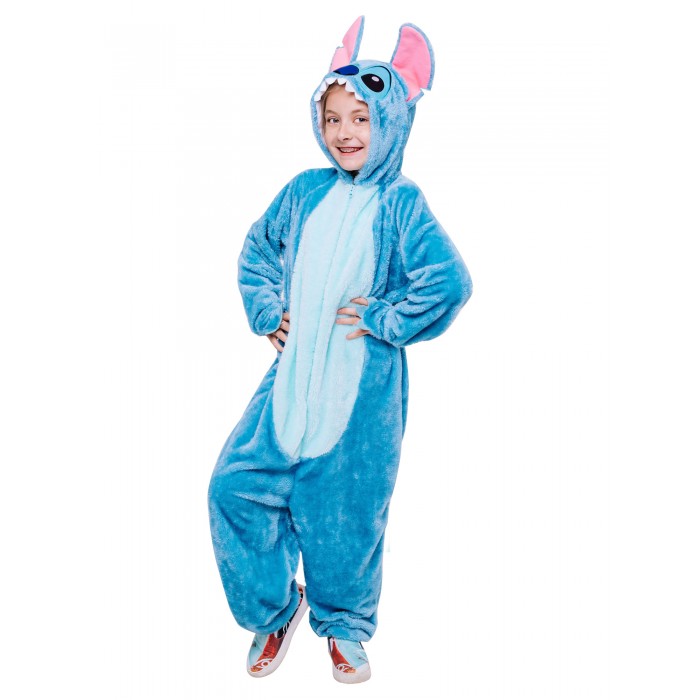 Костюм Стича из мультсериала "Лило и Стич" новогодний для мальчиков и девочек. Костюм представлен в виде синего комбинезона на молнии с капюшоном. Такие комбинезоны в виде популярных персонажей еще называют кигуруми. Костюм изготовлен по лицензии с компанией Дисней.
