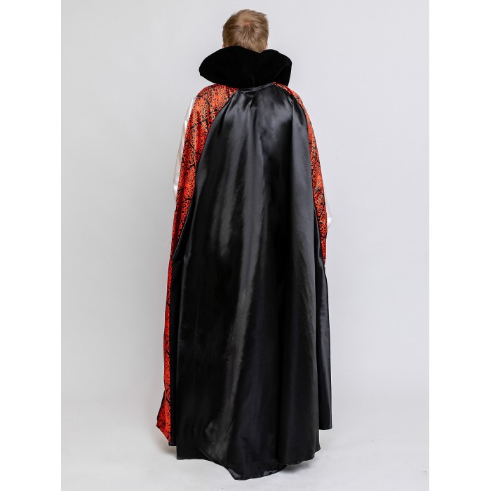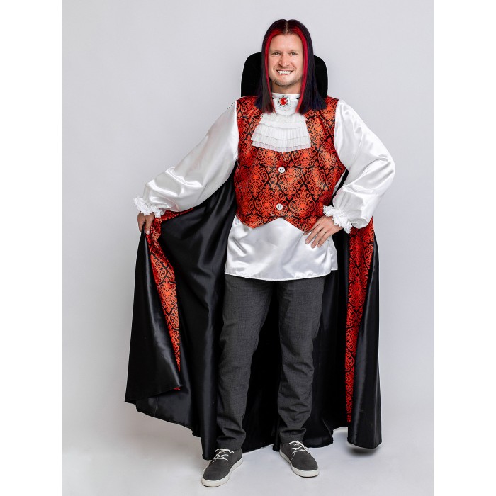 Карнавальный костюм Вампир для взрослых на Хэллоуин. В комплект костюма входят: рубашка, плащ, зубы, грим, парик. Материал - 50% полиэстер, 50% хлопок. Рубашка белого цвета из атласной ткани, с эффектным жабо, спереди пришита имитация узорчатого жилета. Плащ с воротником-стойкой черного цвета и принтованными вставками.