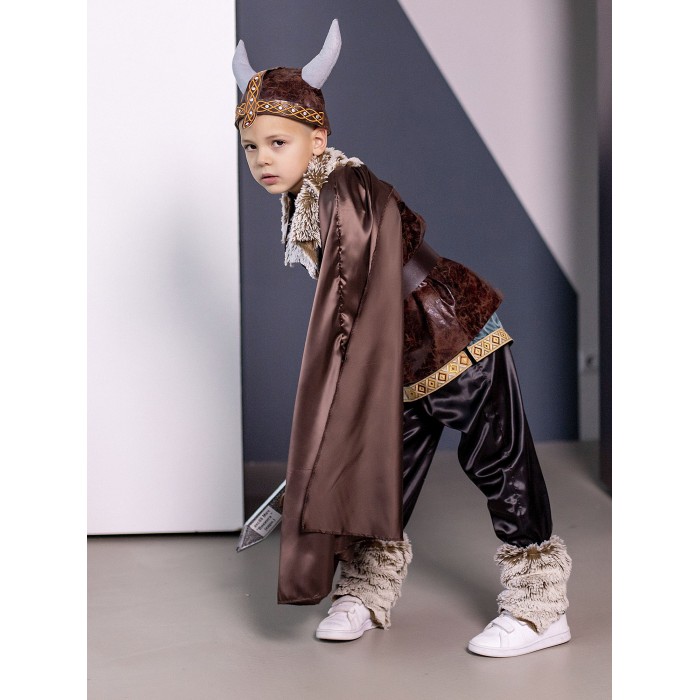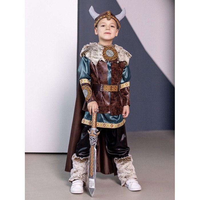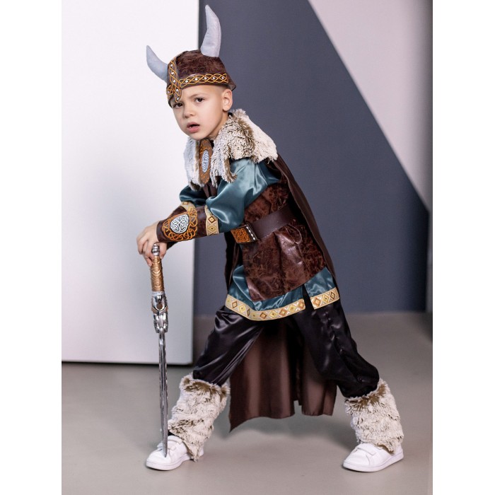 Костюм Викинга детский на 5-10 лет вы можете купить в нашем интернет-магазине. В комплекте рубашка, брюки, жилетка, плащ, наручи, гетры, шлем, меч. Костюм украшен нашивками из кожи с вышивкой. Шлем с рогами, меховая вставка на плечах и меховые гетры.
