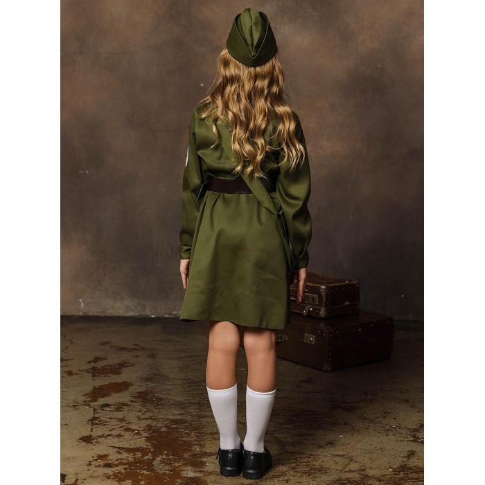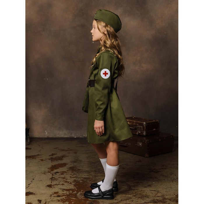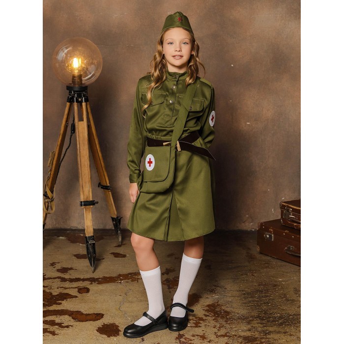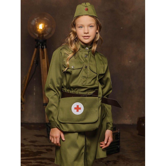 Именно медсестры спасали раненых на поле боя, не боясь идти под градом пуль, выполняли главную задачу – сохранить как можно больше человеческих жизней. Костюм Военная Медсестра для девочек к праздникам 9 мая и 23 февраля представлен в широком ассортименте размеров от 4-х до 12 лет. В комплекте образа гимнастерка, юбка, пилотка, сумка и ремень.
