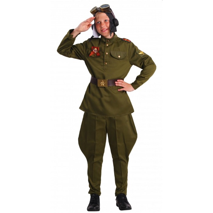 Костюм Военного Летчика превратит любого мальчика в отважного героя и настоящего аса пилотирования. Актуальный образ к 23 февраля и 9 мая позволит детям не забывать об историческом прошлом своей страны, гордиться своими храбрыми предками, которые защищали Родину во время Великой Отечественной войны. Костюм включает в себя гимнастерку, ремень, брюки, шлемофон, очки и орден.