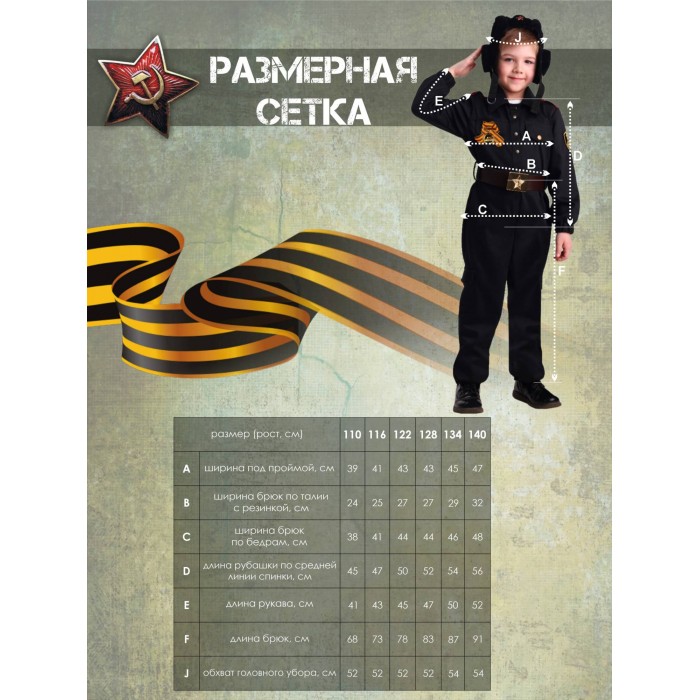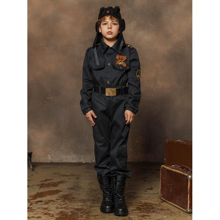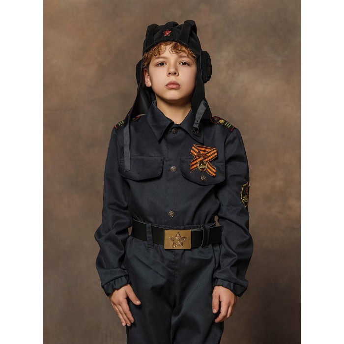 Костюм Военного Танкиста для смелого мальчика, который хочет по-настоящему прикоснуться к истории своего страны. Реалистичный образ относит нас к временам ВОВ, позволяет окунуться в те события, вспомнить наших героев и просто сказать им спасибо. Костюм Военный Танкист в черной расцветке состоит из куртки, брюк, ремня, шлемофона и ордена.
