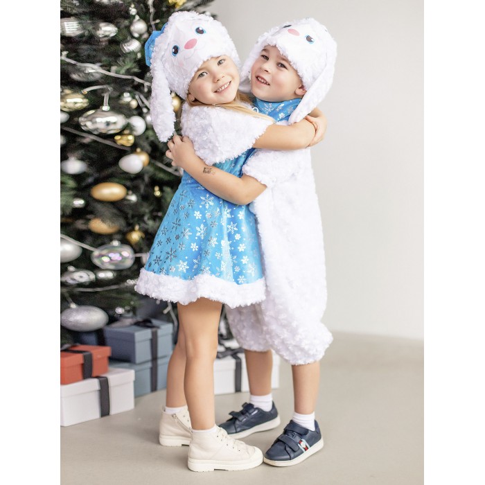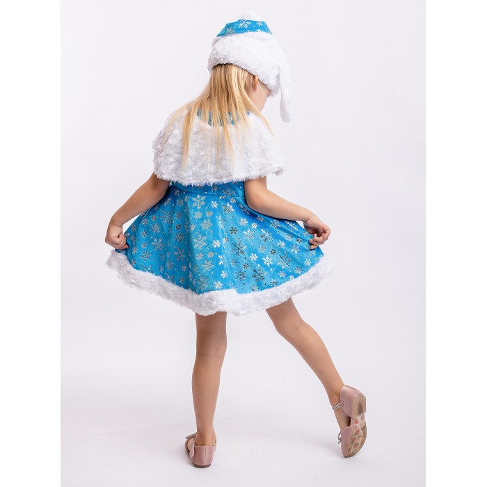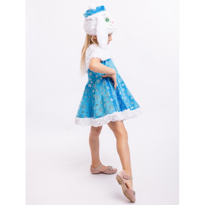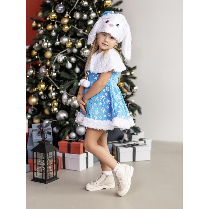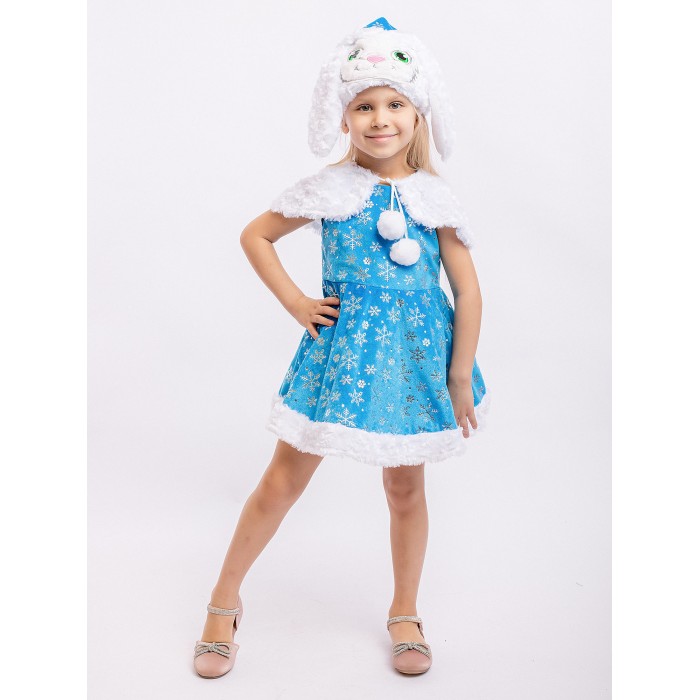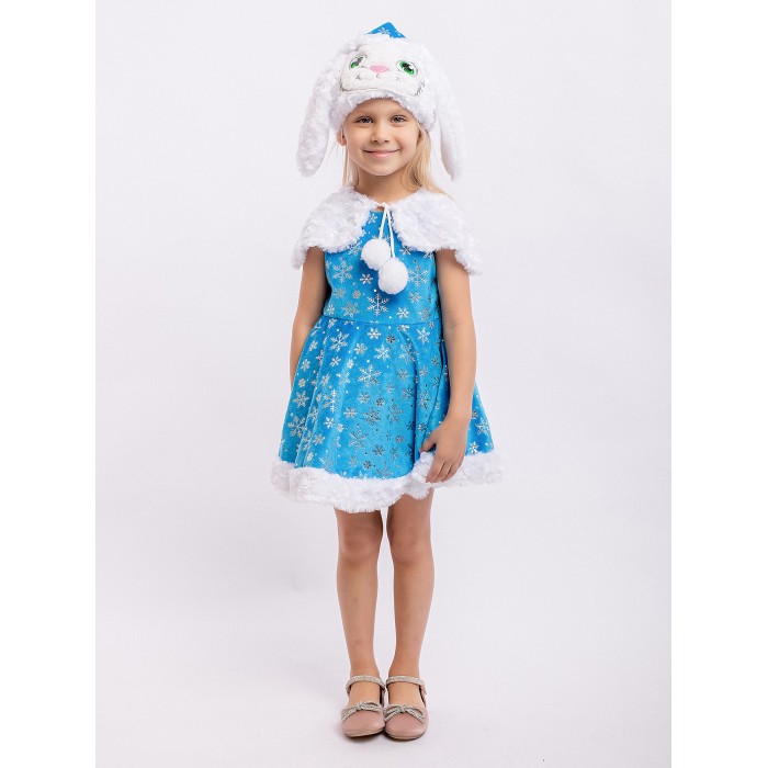 Карнавальный костюм Зайка Зоя для девочки 3-5 лет. В комплекте платье, пелерина, шапка. Очаровательный наряд для новогоднего праздника и спектакля в детском саду или кружке. Платье голубого цвета украшено блестящими узорами в виде снежинок.