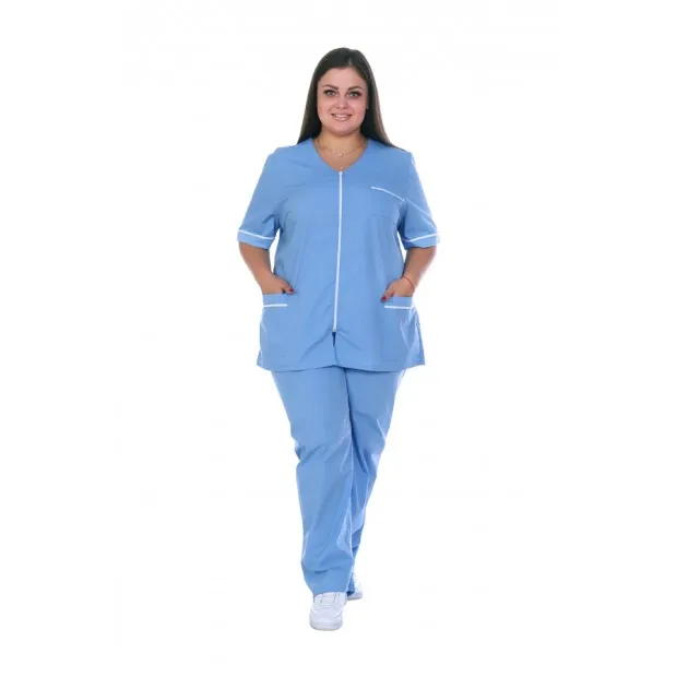 Удобный и практичный костюм женский "Малика" (size +) свободного покроя, состоящий из куртки и брюк. Куртка прямая без рельефов с застежкой на молнию и V-образным вырезом горловины. Рукав короткий. Костюм имеет три накладных кармана, два из которых внизу и один нагрудный. Отделка белого цвета На карманах и рукавах выполнена отделка в виде канта белого цвета. Брюки свободные, прямые, на резинке. Костюм предназначен для персонала сферы обслуживания.