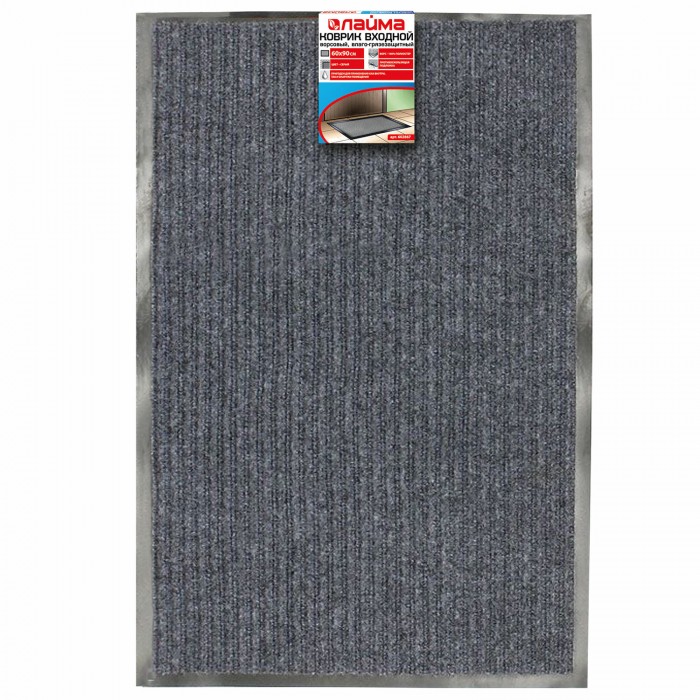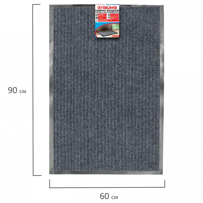 Коврик входной ворсовый влаго-грязезащитный 60х90 см, толщина 7 мм, ребристый, серый, LAIMA, 602867