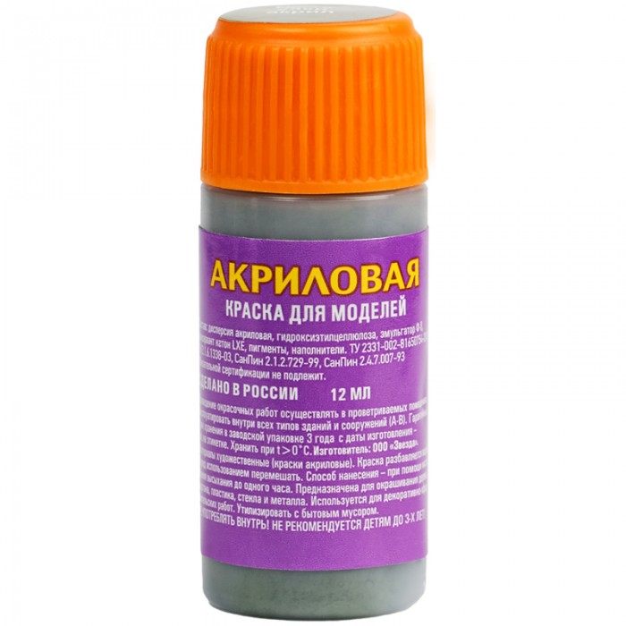 Акриловая краска на водной основе. Краска готова для работы с ней. Краска разбавляется водой. Подходит для окраски моделей из пластика, металла, дерева, бумаги с помощью кисти.