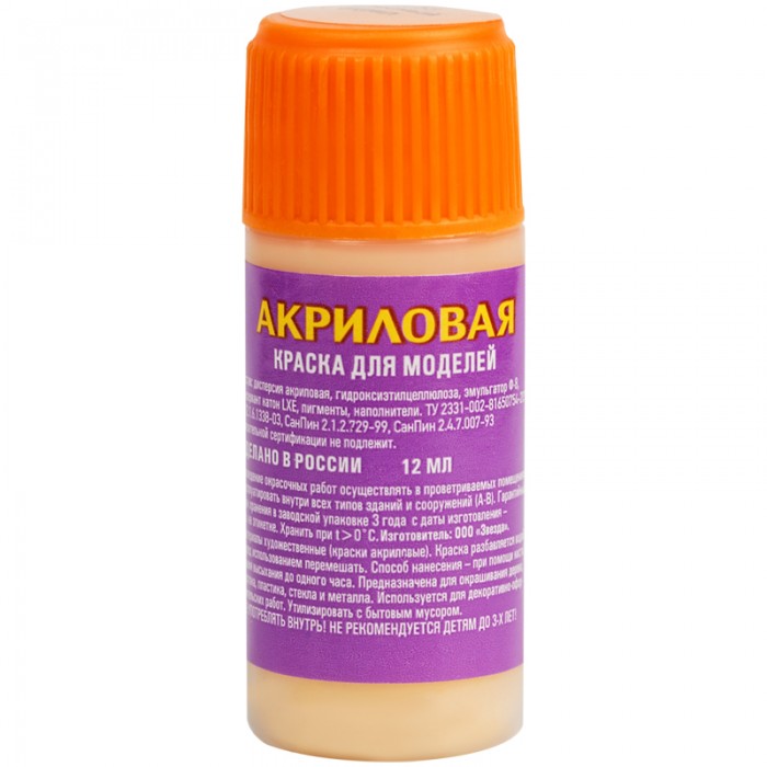 Акриловая краска на водной основе. Краска готова для работы с ней. Краска разбавляется водой. Подходит для окраски моделей из пластика, металла, дерева, бумаги с помощью кисти.