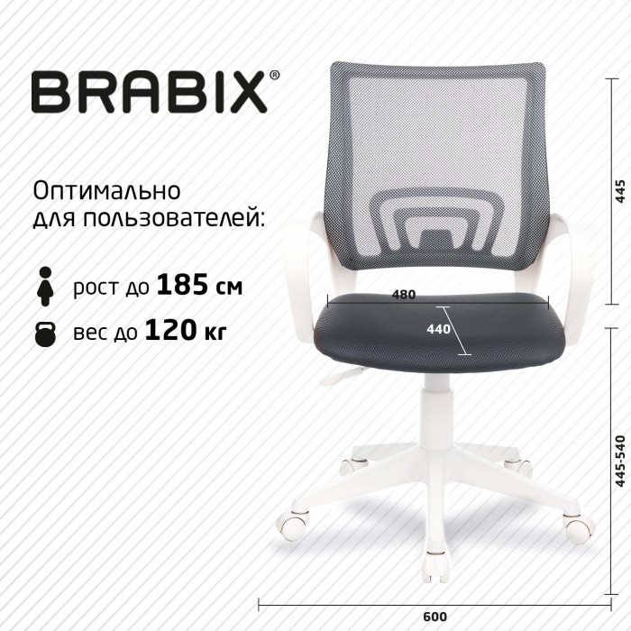 Кресло BRABIX "Fly MG-396W", с подлокотниками, пластик белый, сетка, темно-серое, 532400, MG-396W_532400