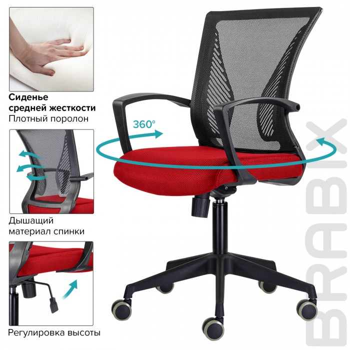 Кресло BRABIX "Wings MG-309", пластик черный, сетка, черное/красное, 532014