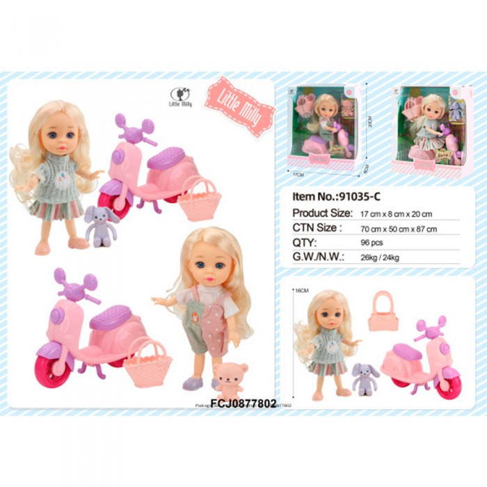 Размер упаковки: 17 х 8 х 20 см Размер изделия: мопед 14,8 х 4 х 11,5 см, мишка 4 см, сумка 5,5 х 4,5 см Высота куклы: 16 см Функционал: игрушка для девочек, куклы и аксессуары Вид упаковки: картонная коробка блистерного типа Страна производитель: КНР Материал: полимеры, текстиль Комплектация: кукла - 1 шт, мопед - 1 шт, мишка - 1 шт, сумка - 1 шт Возраст ребенка: для детей от 3 лет Кукла малышка поможет ребенку в развитии ролевых сценариев, и сделает игру увлекательной. Особенности: - кукла обладает подвижными частями тела - мягкие искусственные волосы, которые ребёнок сможет укладывать в различные причёски - съемная одежда - дополняющие игровые аксессуары - подвижные колеса мопеда - качественные и безопасные материалы