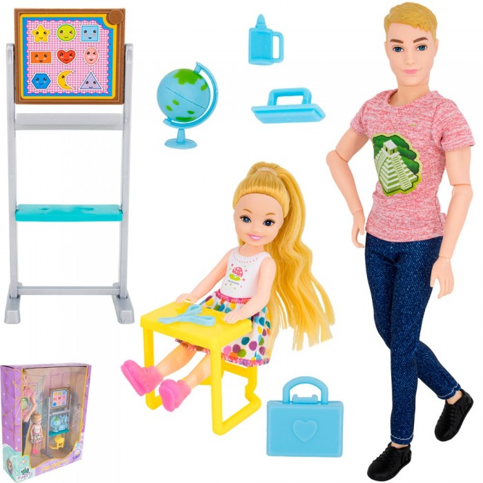 Размер упаковки: 25,5 х 32 х 8,5 см Вид упаковки: картонная коробка Функционал: игрушки для девочек Страна производитель: КНР Материал: пластик Комплектация: кукла Кен учитель (30 см) – 1 шт., кукла учиница (14 см) – 1 шт., учебная доска (9,5 х 22 х 6 см) – 1 шт., парта (6 х 5,5 х 4,5 см) –1 шт., игровые аксессуары – 5 шт. Игровой набор «Моя профессия» от ТМ «Miss Kapriz» предназначен для сюжетно-ролевых игр. Ребенку предлагается почувствовать себя в роли настоящего учителя и провести урок. В набор входит – взрослая кукла в виде Кена, кукла ребенок, учебная доска с подвижными элементами, парта и множество дополнительных игровых аксессуаров. Изготовлено из высококачественных, безопасных и нетоксичных материалов. Особенности: - большой набор с множеством игровых элементов; - у куколок милые и радушные лица; - длинные волосы (можно делать разнообразные прически); - подвижные ручки и ножки; - стильный комплект одежды. Игры куклами очень полезны для эмоционального