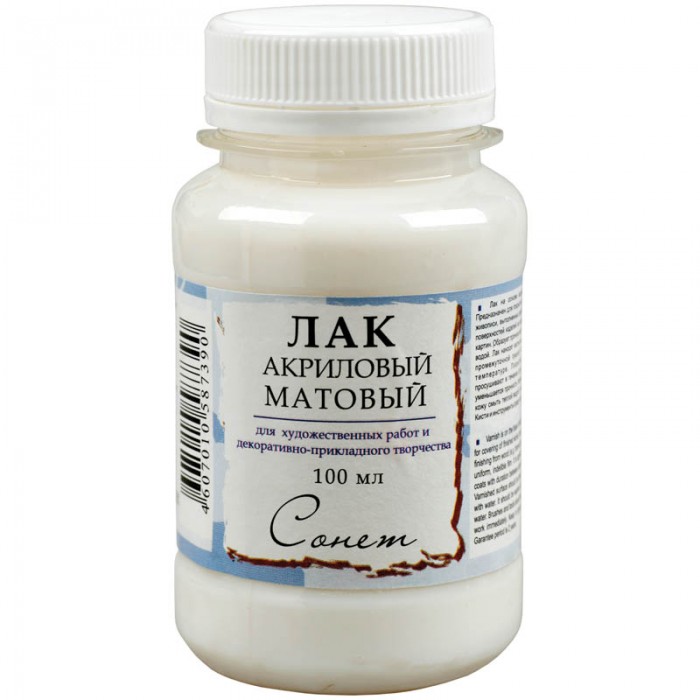 Лак акриловый, матовый, 100 мл. На основе водной акриловой дисперсии. Предназначен для завершающего покрытия работ, выполненных акриловыми красками, а также для использования в декоративных техниках (декупаж, кракелюр, роспись по различным поверхностям). Создавая на поверхности прочную пленку, акриловый лак «Decola» защищает работу от воздействий внешней среды. Придает поверхности изделия законченный вид с матовым эффектом.