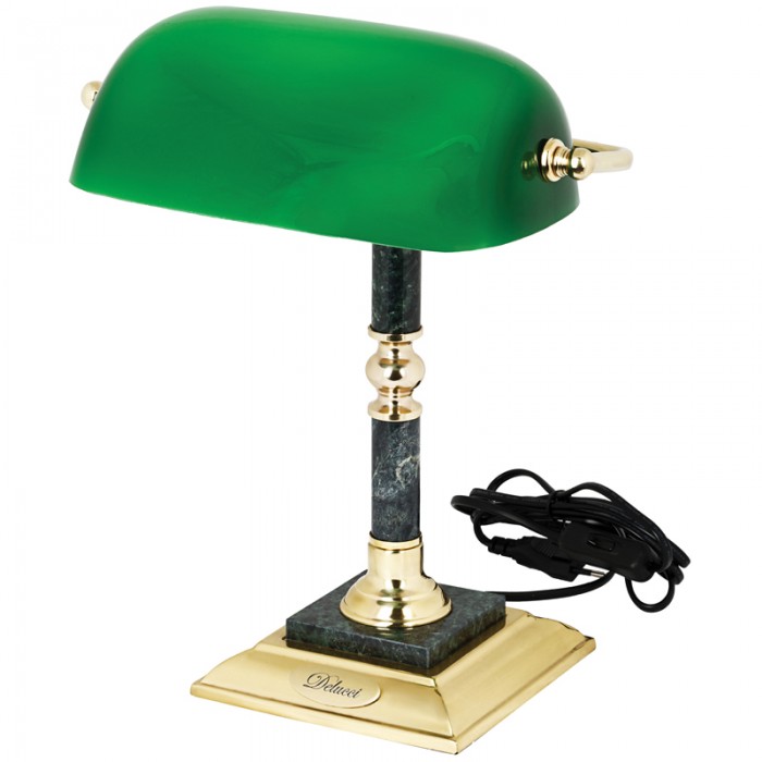 Стильная настольная лампа Delucci изготовлена из натурального зелёного мрамора, что добавляет ей статусности и изящности. Абажур можно регулировать по наклону, подстраивая направление освещения при письме. Настольная лампа будет отличным подарком руководителю, став яркой деталью офиса или домашнего кабинета. Рекомендуется лампочка стандарта E27 (в комплект не входит). • Цвет: зелёный; • тип упаковки: подарочная коробка; • материал: мрамор/металл; • материал подставки: мрамор;