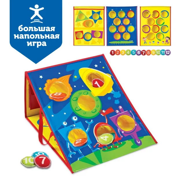 В игровой форме познакомит детей с арифметикой и начальной математикой:посчитайте, сколько мешочков попало в лунки игрового поля? А сможете ли Вы составить примеры из значении, указанных на мешочках? А умножить? А разделить?