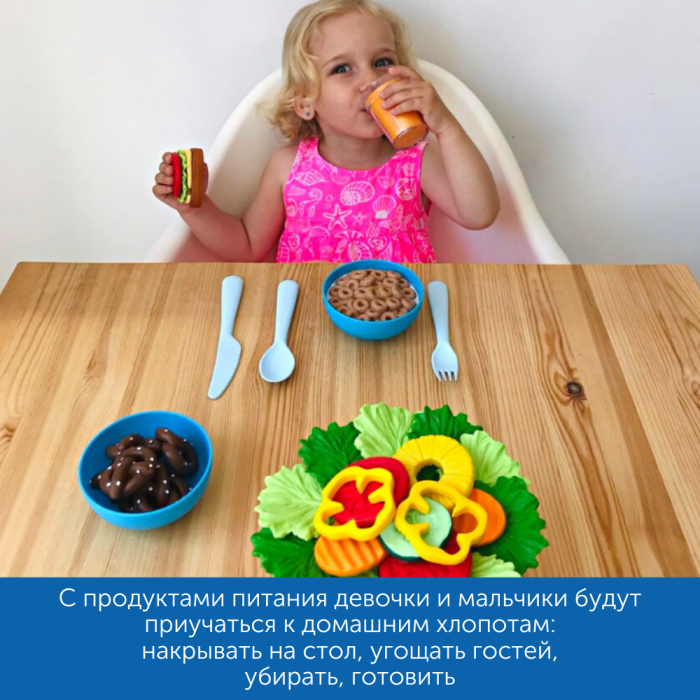 Аппетитные продукты составляют сбалансированное питание на день. Все продукты сделаны из мягкой эластичной пластмассы, не содержащей токсичный бисфенол. Дети могут бросать фигурки и кусать их, а форма изделий из-за этого не изменится.