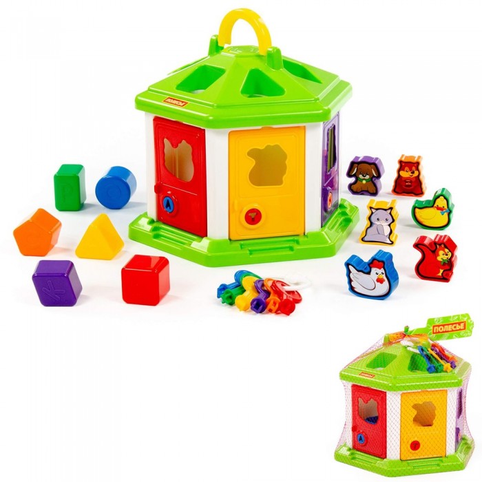 Возраст: от 1 года Размер: 26 х 24 х 21 см. В комплекте: домик, 12 формочек, 6 ключей, наклейки. Вес: 0,5 кг. Упаковка: сеточка. Материал: пластик. Производитель: Полесье. Страна бренда: Белоруссия - Эта яркая развивающая игрушка представляет собой домик со множеством дверей и крышей, на корпусе которых предусмотрены отверстия. - Именно в них крохам предстоит вставлять фигурки из комплекта в виде зверушек, геометрических фигур и букв, ориентируясь по их форме. - А, чтобы достать обратно аксессуар, малышу надо подобрать ключик к дверце из разноцветной связки. - Таким образом в процессе игры с домиком дети одновременно знакомятся с фигурами, названиями животных, цветами и буквами, расширяя при этом свой кругозор. - А вставляя фигурки в отверстия, они еще и улучшают мелкую моторику рук. - Домик и аксессуары выполнены из ударопрочного пластика, который сертифицирован и абсолютно безопасен для детей. - А яркие цвета корпуса надолго останутся такими же насыщенными благо