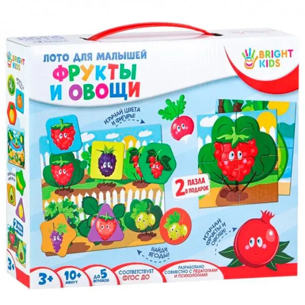 Размер упаковки: 24,6 x 18,6 x 4,9 см Вес: 230 г Упаковка: Коробка закрытая цветная Функционал: развивающие игры для детей Вид: лото Страна обладатель бренда: Китай Материал: картон, пластик, металл, бумага Комплектация: лото – 1 шт Возраст ребенка: детям с 3+ лет "Фрукты и овощи" – увлекательная и познавательная игра, в которую можно играть как с одним ребенком, так и с группой до пяти детей. Лото в лёгкой и игровой форме познакомит ребёнка с разнообразием растительного мира. Он узнает с помощью красочных картинок, как называются различные фрукты и овощи. Развивает: -память, -внимательность, -усидчивость, -образное мышление, -мелкую моторику, -цветовое восприятие.