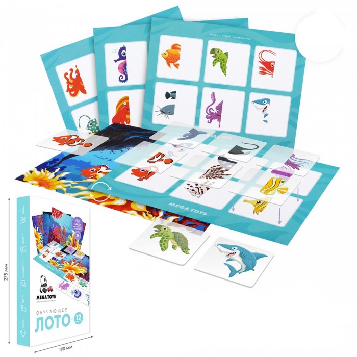 Размер упаковки: 27,5 х 19 х 4 см Вид упаковки: картонная коробка Страна производитель: Россия Материал: пластик, картон, текстиль Комплектация: карточки прозрачные (5 х 5 см) – 36 шт., карточки двухсторонние (формат А5) – 4 шт., мешок – 1 шт., обучающее пособие – 1 шт. Вес: 237 гр. Возраст: 3+ «Лото. Подводный мир» - увлекательная обучающая игра, которая понравится всем детям любого возраста! В процессе игры ребенок узнает много интересного про морских обитателей. Правила игры входят в комплект. Игра развивает зрительное восприятие, внимание, пространственное и логическое мышление, учит анализировать и сопоставлять.