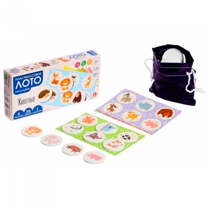 Размер упаковки: 9,5 х 20 х 3 см Функционал: обучающие игры для детей Вид: лото Вес: 140 г Упаковка: закрытая цветная коробка Страна обладатель бренда: Россия Материал: картон, пластик Комплектация: 6 карточек 14,5 х 9 см, 36 пластиковых фишек (диаметр - 4 см), мешочек. Возраст ребенка: детям с 3+ лет. Лото пластмассовое «Животные» позволит в игровой форме познакомить ребенка с разными животными, обитающими на нашей планете. Игра развивает память, внимание, мелкую моторику рук, помогает освоить русский алфавит и расширяет кругозор.