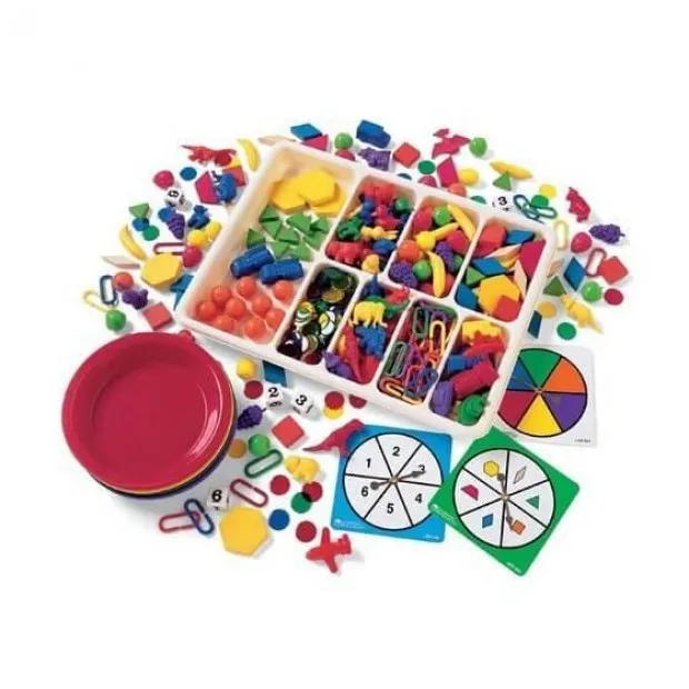 В набор входят 600 предметов. Фигурки сельскохозяйственных животных, машинок и фруктов, соединительные «скрепки», геометрические блоки для составления рисунков, прозрачные разноцветные кружочки. Также к нему идут 6 цветных тарелок, лоток для сортировки и методическое пособие.
