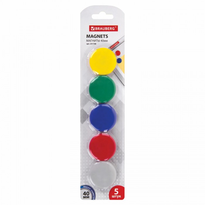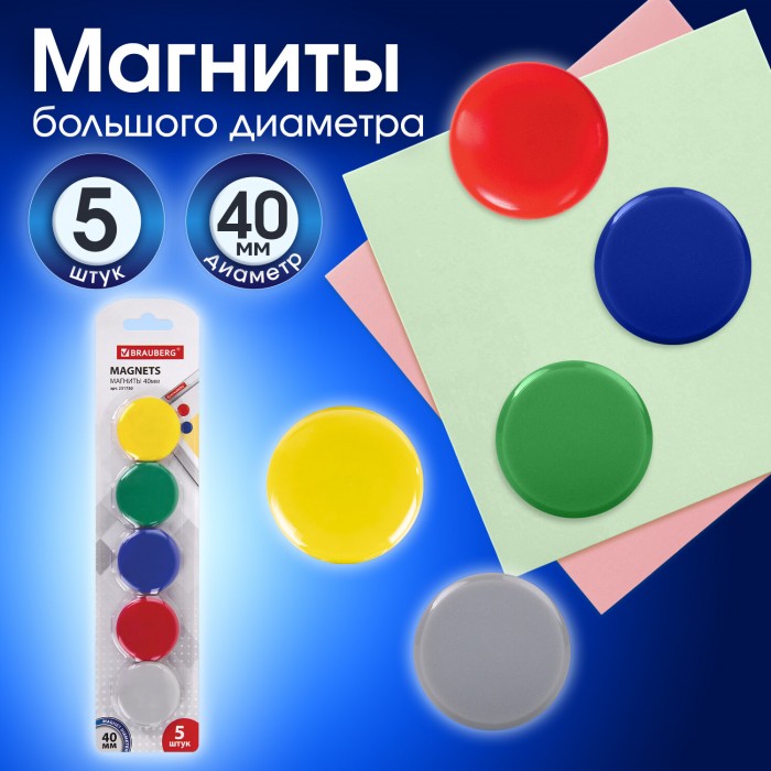 Магниты БОЛЬШОГО ДИАМЕТРА, 40 мм, КОМПЛЕКТ 5 штук, цвет АССОРТИ, в блистере, BRAUBERG, 231730