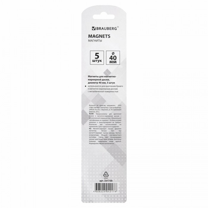 В интернет-магазине AV Group можно купить Магниты БОЛЬШОГО ДИАМЕТРА, 40 мм, КОМПЛЕКТ 5 штук, цвет АССОРТИ, в блистере, BRAUBERG, 231730, производитель Китай, артикул 231730 по цене 236 руб. Продаем физическим и юридическим лицам, при условии минимальной суммы заказа (общей суммы в корзине) от 5 тысяч рублей. Возможна доставка курьером по Верхней Пышме, Екатеринбургу и Свердловской области. В регионы отправляем транспортной компанией. Чтобы уточнить необходимое количество товара и дополнительные условия, звоните: 8(800)201-75-47, менеджер вас проконсультирует.