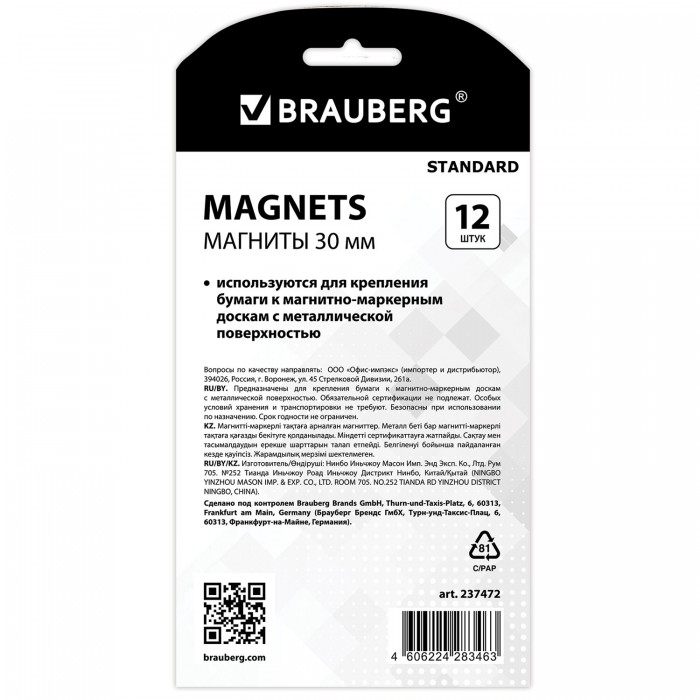 Магниты BRAUBERG "STANDARD" 30 мм, НАБОР 12 шт., ассорти, 237472