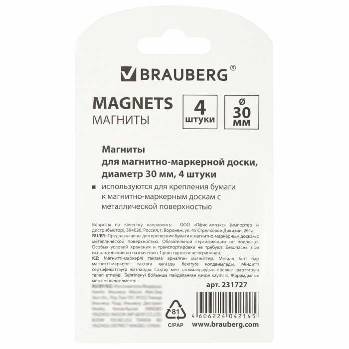Магниты BRAUBERG круглой формы с пластиковым покрытием для магнитно-маркерных досок.