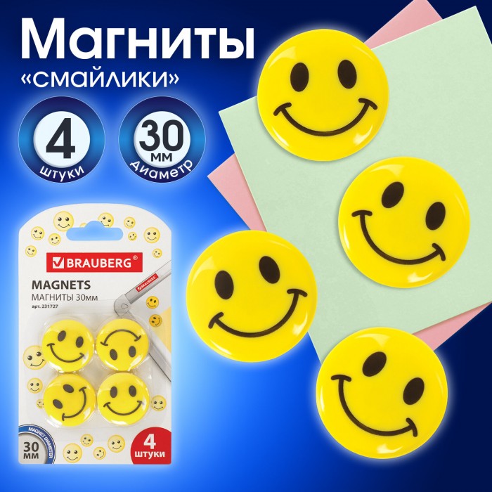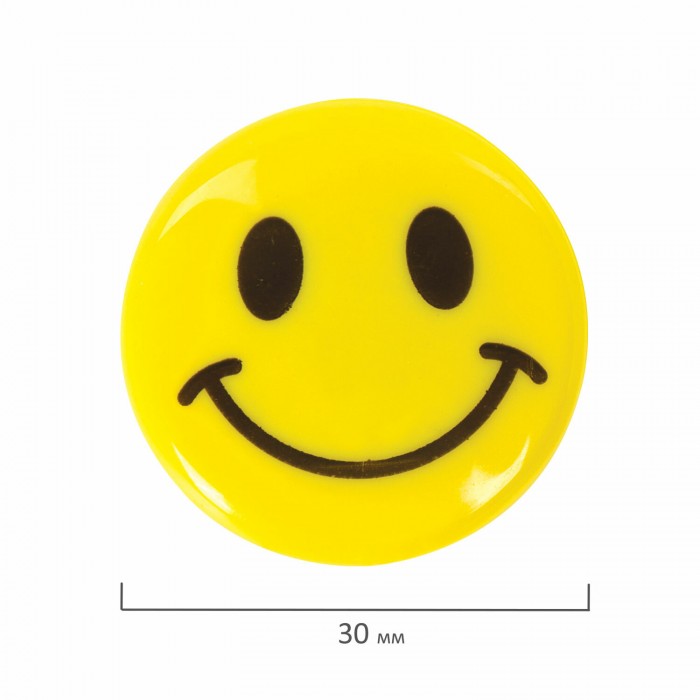 Магниты диаметром 30 мм, КОМПЛЕКТ 4 штуки, "СМАЙЛИКИ", ЖЕЛТЫЕ, в блистере, BRAUBERG, 231727
