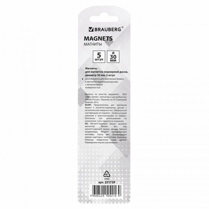 В интернет-магазине AV Group можно купить Магниты диаметром 30 мм, КОМПЛЕКТ 5 штук, цвет АССОРТИ, в блистере, BRAUBERG, 231729, производитель Китай, артикул 231729 по цене 105 руб. Продаем физическим и юридическим лицам, при условии минимальной суммы заказа (общей суммы в корзине) от 5 тысяч рублей. Возможна доставка курьером по Верхней Пышме, Екатеринбургу и Свердловской области. В регионы отправляем транспортной компанией. Чтобы уточнить необходимое количество товара и дополнительные условия, звоните: 8(800)201-75-47, менеджер вас проконсультирует.
