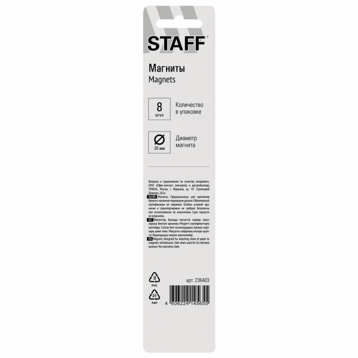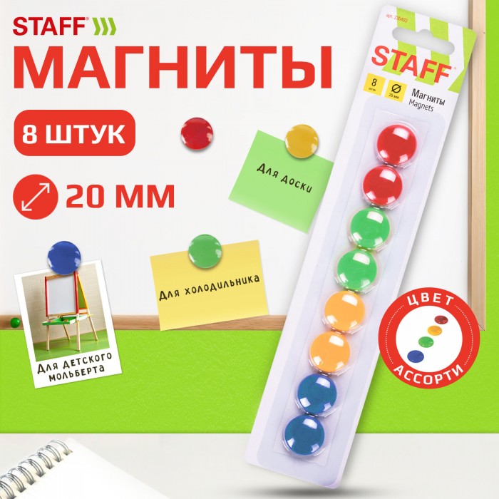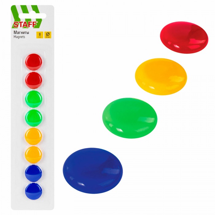 Магниты МАЛОГО ДИАМЕТРА, 20 мм, КОМПЛЕКТ 8 штук, цвет АССОРТИ, в блистере, STAFF "Basic", 236403