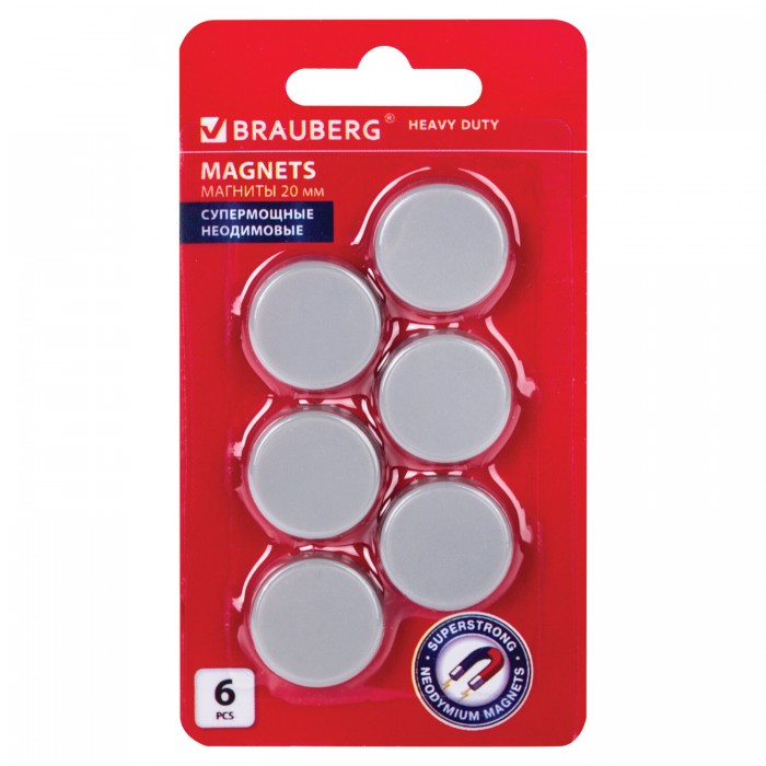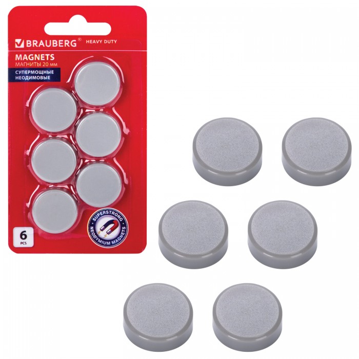 Магниты СУПЕРМОЩНЫЕ НЕОДИМОВЫЕ 20 мм (МАЛОГО ДИАМЕТРА), НАБОР 6 шт., серые, BRAUBERG "HEAVY DUTY", 237485